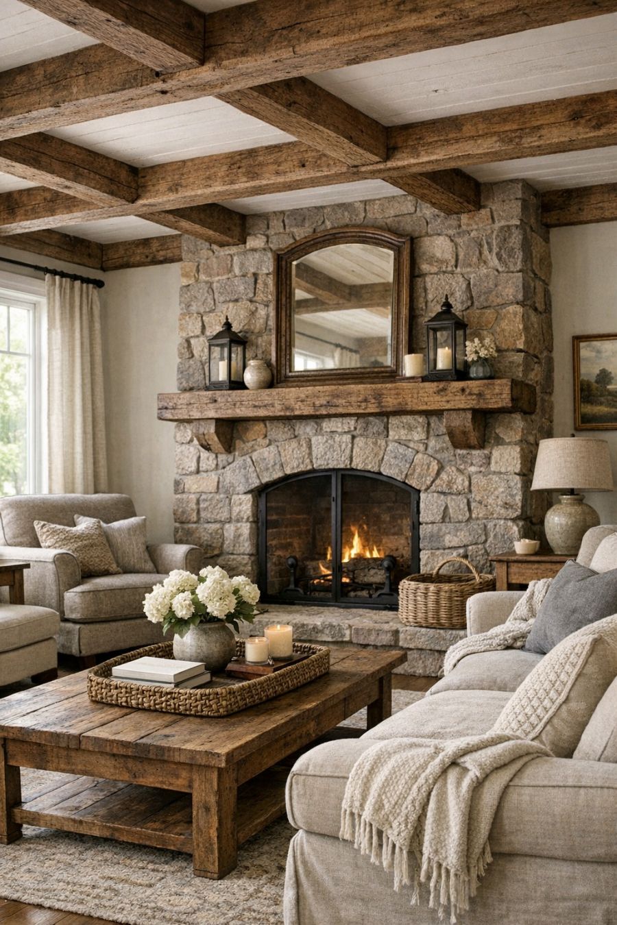 Upon entering the living area, one is struck by the harmonious blend of traditional and contemporary design elements. Exposed wooden beams traverse the ceiling, adding a touch of old-world charm, while the stone fireplace stands as a magnificent centerpiece, offering warmth and a sense of history. Soft, neutral tones dominate the color palette, creating a calming atmosphere that is further enhanced by plush, comfortable furnishings. Large windows allow natural light to flood the space, highlighting the rustic yet refined decor that characterizes this inviting room.