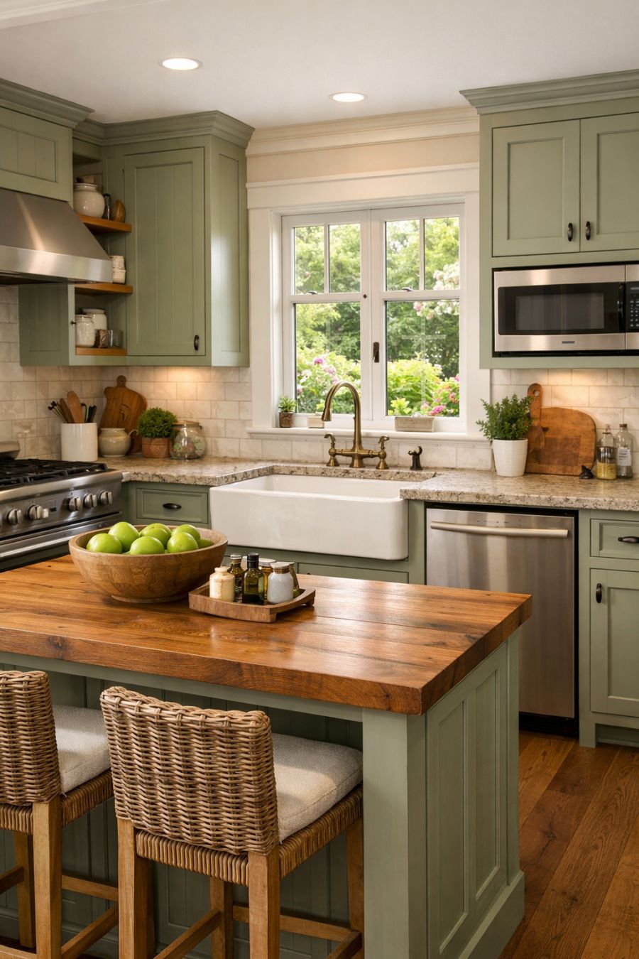 The kitchen is a delightful blend of classic design and modern convenience. Custom cabinetry, painted in a gentle sage green, provides ample storage while complementing the natural stone countertops. A large, farmhouse-style sink sits beneath a window that offers views of the lush garden outside. State-of-the-art appliances are seamlessly integrated into the design, ensuring functionality without compromising on style. An island with a butcher block top provides additional workspace and casual seating, making the kitchen both a practical and inviting hub of the home.