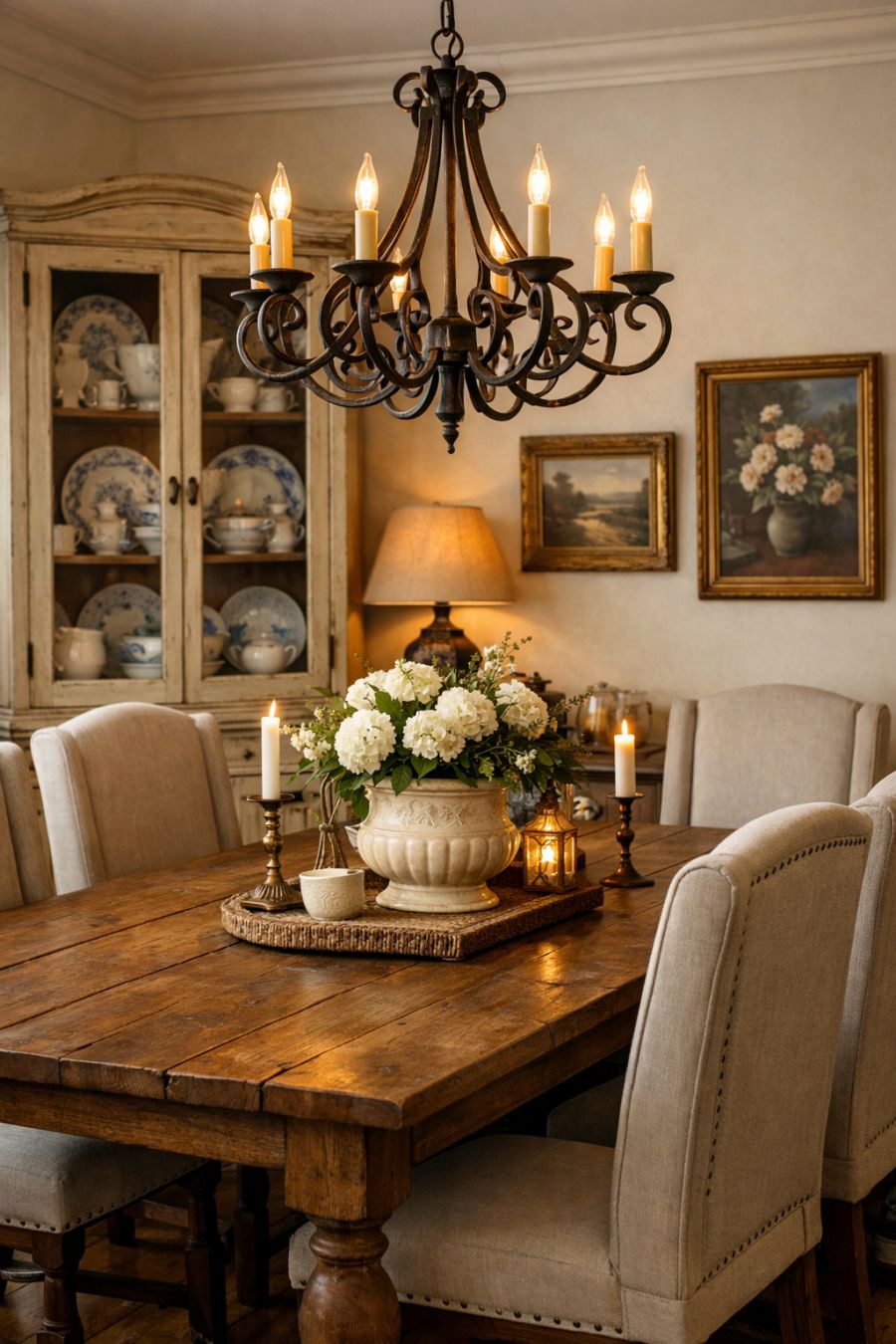 The dining area is an elegant space that seamlessly combines functionality with style. A large, handcrafted wooden dining table takes center stage, surrounded by high-backed chairs upholstered in a soft, muted fabric. The ambiance is further enriched by a wrought iron chandelier that casts a warm, inviting glow over the room. Tasteful accents, such as vintage china displayed in a glass-fronted cabinet and tasteful artwork adorning the walls, add layers of personality and charm. This is a space where family gatherings and intimate dinners alike are destined to become cherished memories.