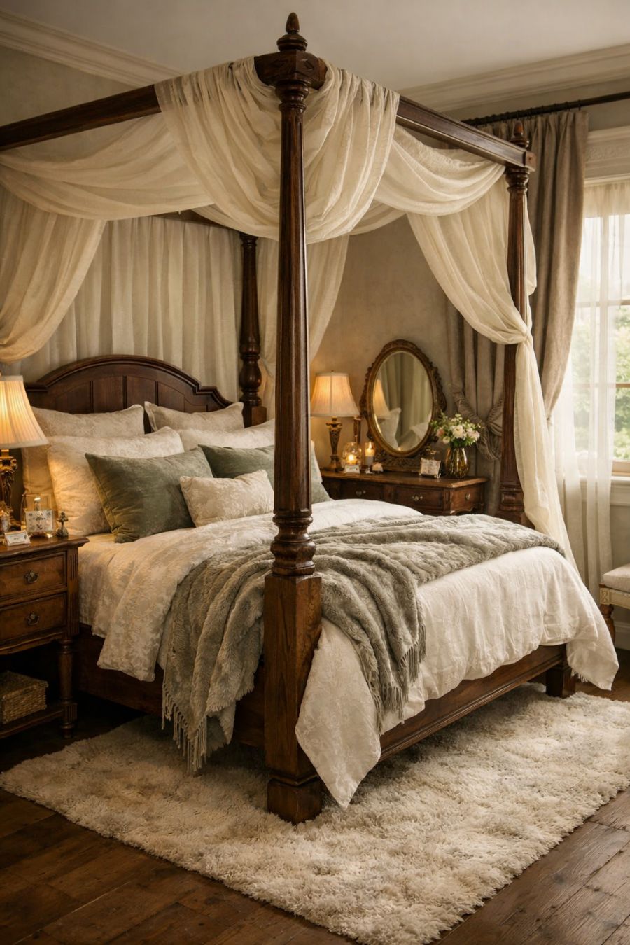 The bedroom is a serene sanctuary designed for rest and relaxation. Soft, muted colors create a calming environment, while luxurious textiles—plush rugs, velvet throws, and crisp linens—add layers of comfort. The centerpiece is a grand four-poster bed, its elegant drapery lending a sense of romance and timelessness. Large windows framed by heavy curtains allow for adjustable natural light, enhancing the room's tranquil atmosphere. Thoughtful design details, such as antique bedside tables and a vintage vanity, complete the space, making it both functional and beautiful.
