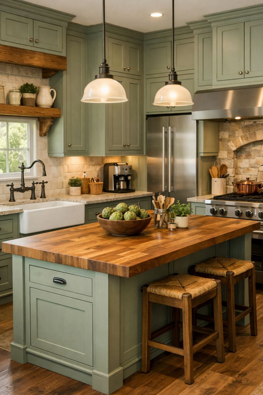 The kitchen is a chef's dream, combining functionality with charming design. Custom cabinetry, painted in a soft sage green, provides ample storage while complementing the natural stone countertops. A farmhouse sink, complete with a vintage-style faucet, adds a touch of rustic charm. The centerpiece is a large, freestanding island with butcher block surfaces, perfect for meal preparation and casual dining. High-end appliances are seamlessly integrated into the design, ensuring modern convenience amid the classic aesthetics.