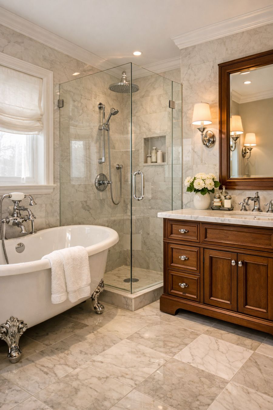 The bathroom is a sanctuary of elegance and functionality, featuring a harmonious blend of classic and contemporary design elements. Marble tiles in soft, neutral tones cover the floor and walls, creating a sense of continuity and space. A freestanding clawfoot bathtub invites leisurely soaks, while a modern glass-enclosed shower offers convenience for busy mornings. The vanity, crafted from rich wood with a marble countertop, is both stylish and practical, providing ample storage. Polished chrome fixtures and soft, ambient lighting complete the space, ensuring a serene environment for daily rituals.