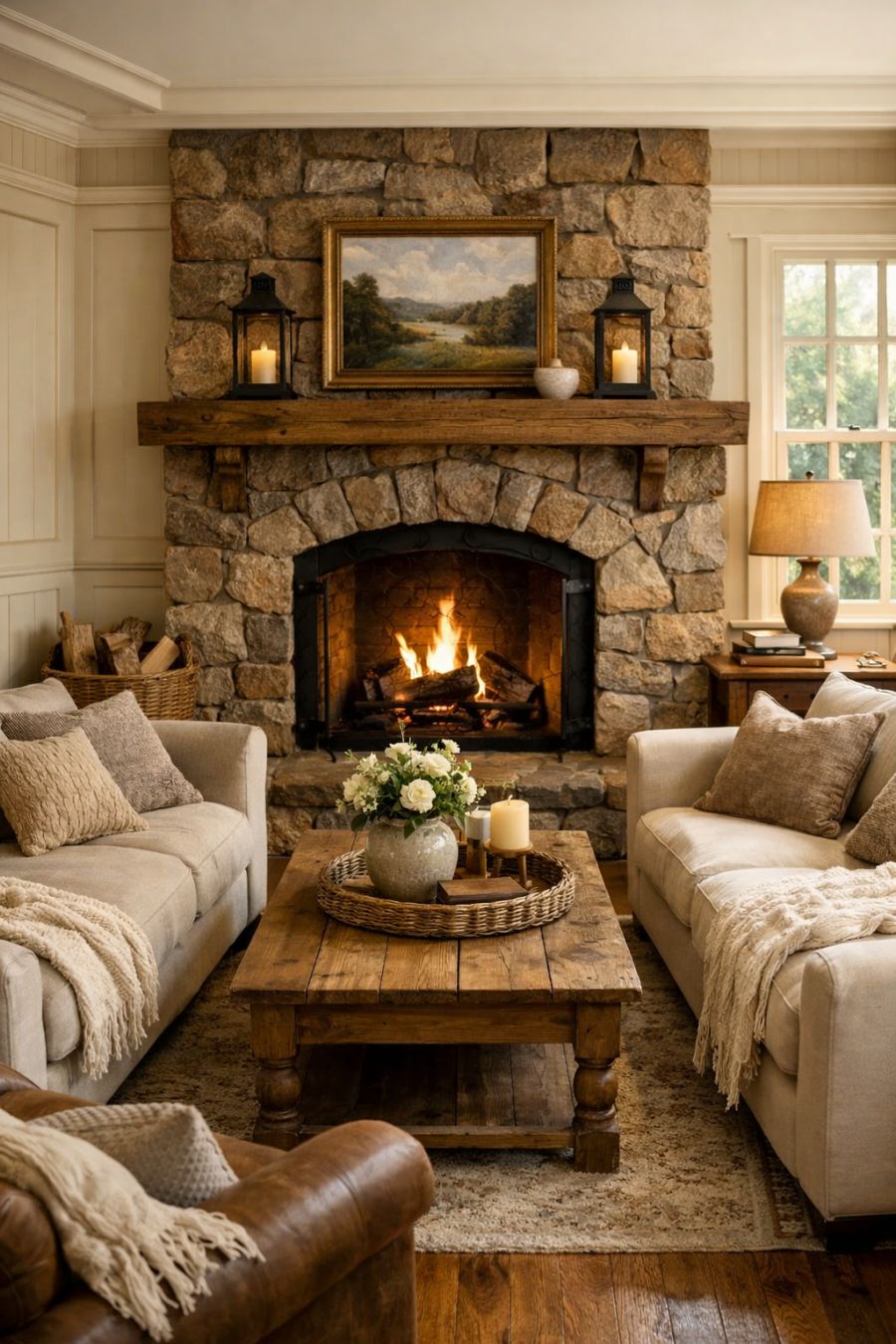 Step inside to find a living area that exudes warmth and sophistication. The design is anchored by a large stone fireplace, offering a cozy focal point for gatherings or quiet evenings. Plush, neutral-colored sofas are arranged to facilitate conversation, while soft, textured throws add layers of comfort. The walls are adorned with classic wainscoting, painted in a soft cream that complements the natural light streaming through the mullioned windows. Hardwood floors, with their rich patina, ground the space, making it both inviting and timeless.