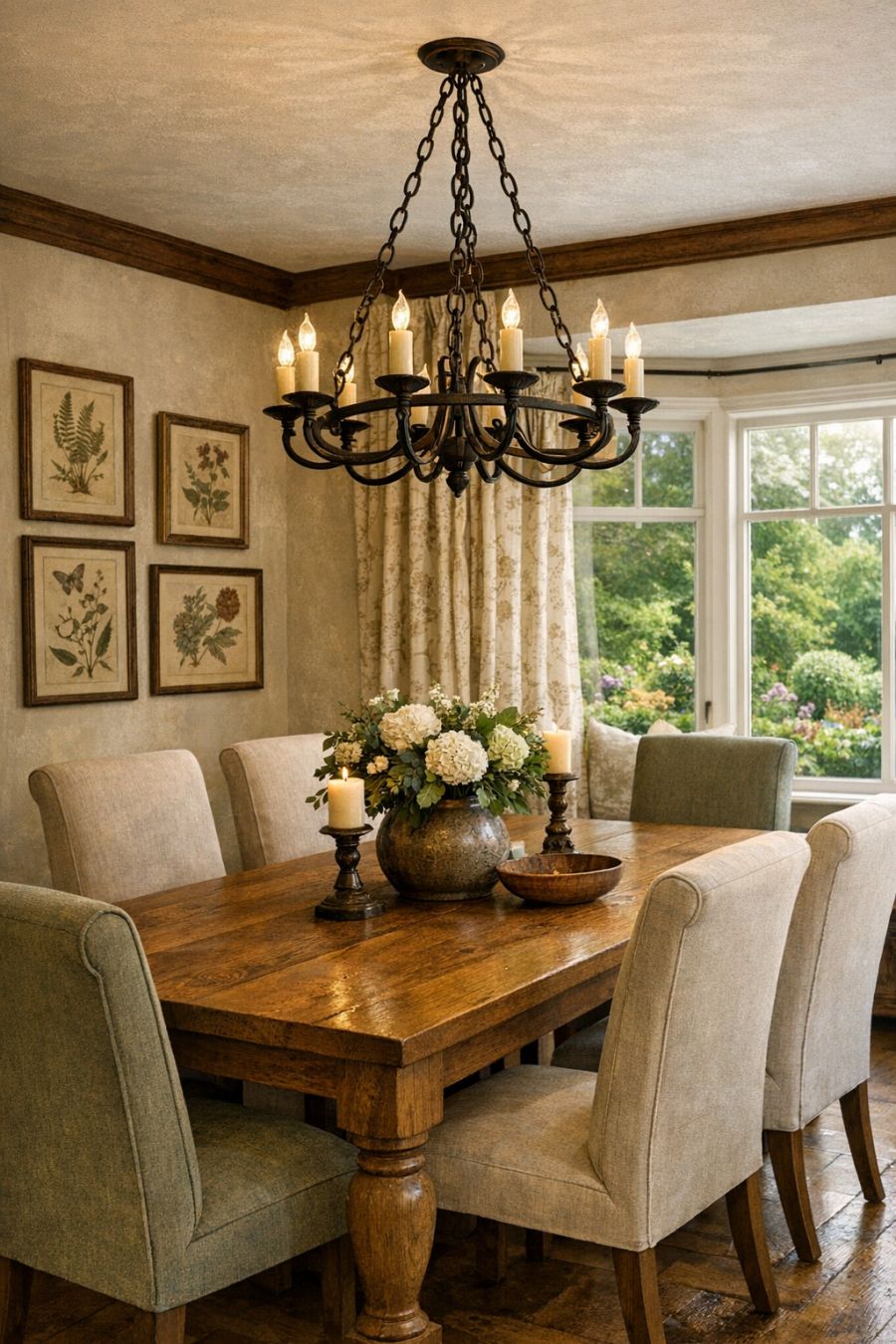 The dining area is a seamless extension of the living space, designed for both intimate family meals and lively dinner parties. A large oak dining table takes center stage, surrounded by high-backed chairs upholstered in a soft, muted fabric. Above, a wrought iron chandelier casts a gentle glow, creating an atmosphere of understated elegance. The walls are adorned with vintage botanical prints, adding a touch of nature's beauty indoors. A large bay window offers picturesque views of the surrounding gardens, enhancing the dining experience with a sense of tranquility.