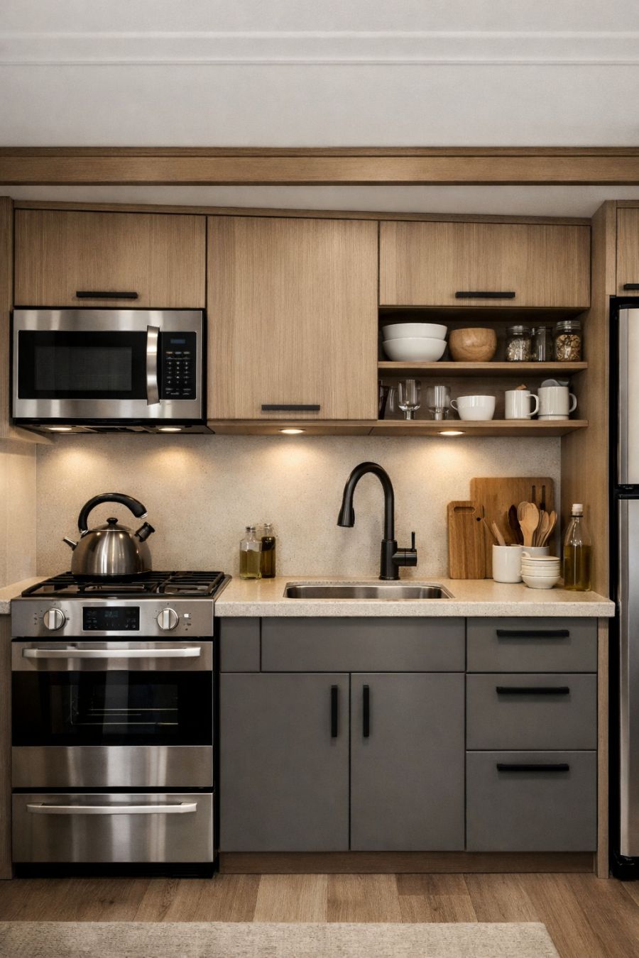 The kitchen area is a testament to the beauty of modern efficiency, with a layout that maximizes space without compromising on style. Sleek cabinetry with flat fronts and integrated handles offers ample storage, while a compact countertop provides a practical workspace. Stainless steel appliances blend seamlessly into the design, offering a touch of sophistication and modern convenience. Open shelving displays curated kitchenware, adding a personal touch and maintaining the room's airy, uncluttered feel.