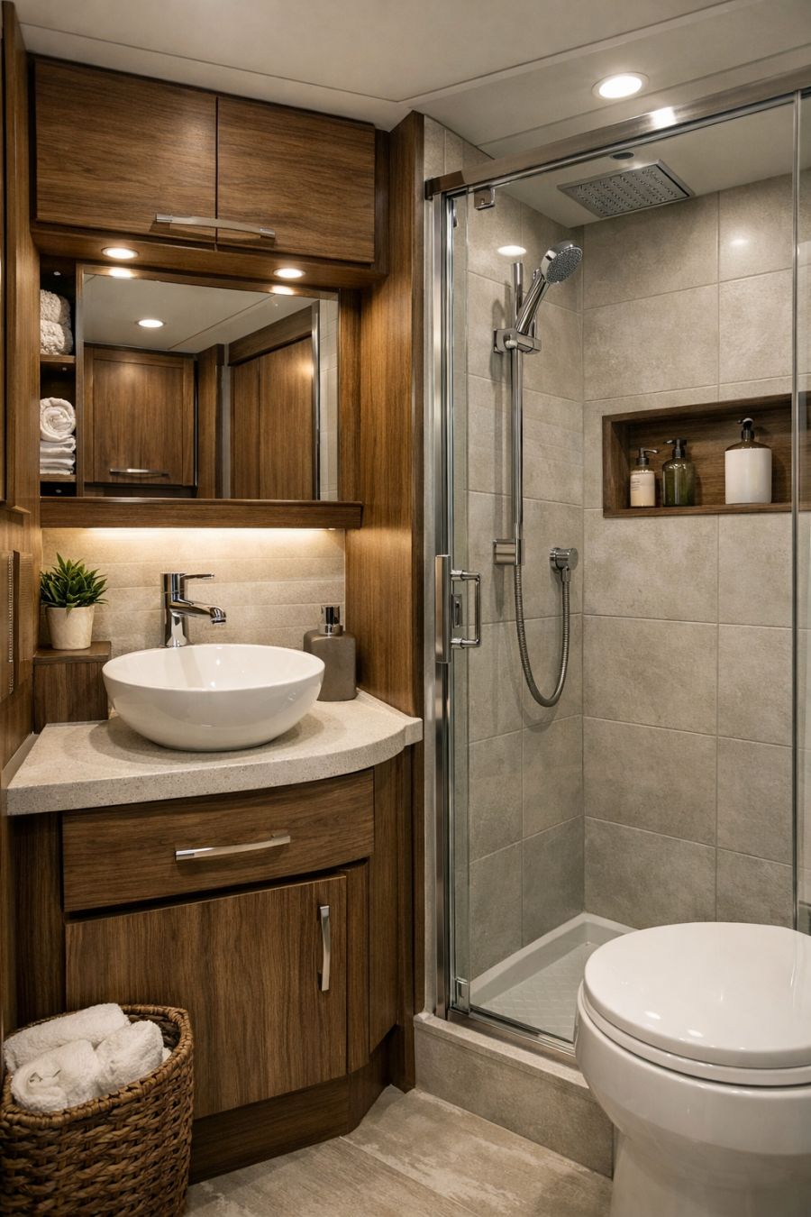 The bathroom area is a masterclass in modern design, striking a balance between functionality and style. Richly grained wood accents and a neutral color scheme create a soothing atmosphere, enhanced by sleek fixtures and clever storage solutions. A compact vanity with a vessel sink and polished chrome faucet adds a touch of elegance, while a frameless glass shower enclosure provides a sense of openness. The use of natural materials and thoughtful design elements ensures a harmonious blend with the overall aesthetic of the home.