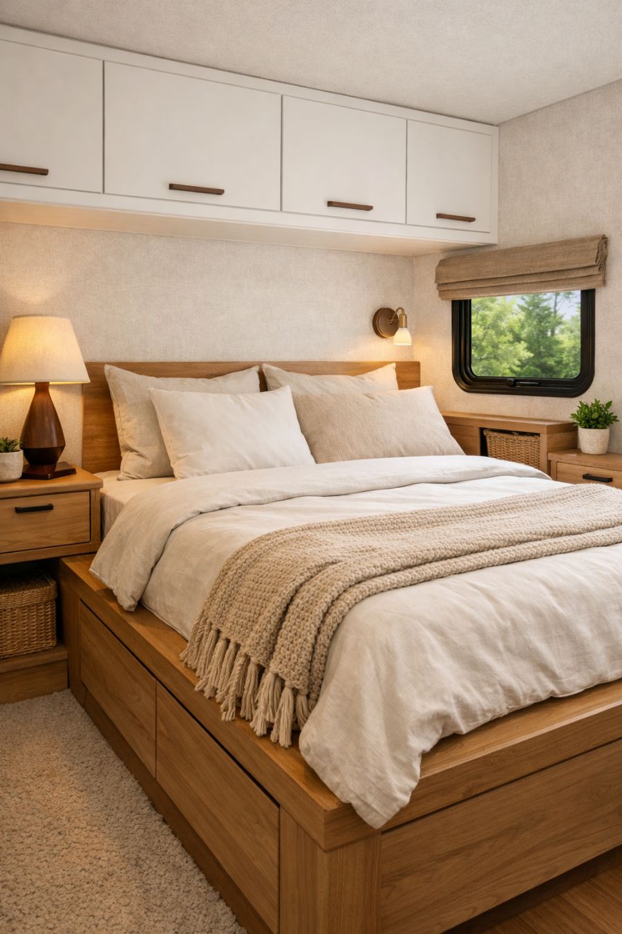 The bedroom area embraces a serene and minimalist approach, providing a restful retreat within the home's compact framework. A platform bed with a wooden frame anchors the space, complemented by soft, neutral bedding that enhances the room's calming ambiance. Built-in storage solutions ensure functionality without detracting from the clean aesthetic. A small window offers a glimpse of the outdoors, while carefully chosen accents like a mid-century style lamp and a woven throw add warmth and personality.