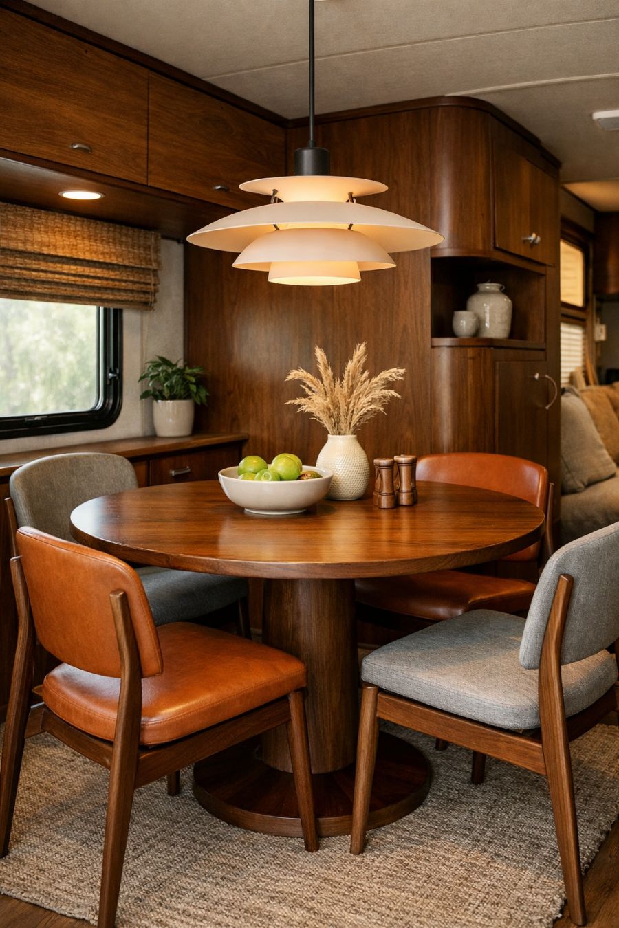 Adjacent to the living area, the dining space continues the mid-century modern theme with a stylish yet functional setup. A round wooden table takes center stage, surrounded by sleek chairs with tapered legs that echo the era's design philosophy. Overhead, a pendant light with a sculptural form provides ambient illumination, casting a warm glow over meals. The use of natural materials and simple forms creates a cohesive flow from the living area, fostering a sense of unity and elegance.