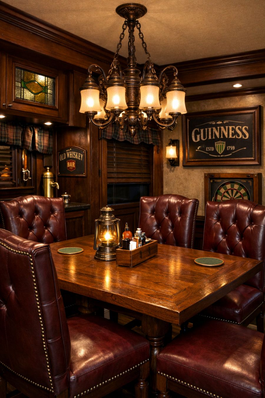 Adjacent to the living area, the dining space continues the pub theme with its dark wood furniture and vintage accents. A sturdy oak dining table stands at the center, surrounded by high-backed chairs upholstered in deep burgundy leather. An antique chandelier hangs overhead, casting a soft light that reflects off the polished surfaces. This space is perfect for intimate meals or lively gatherings, enveloped in an ambiance that invites stories and laughter.