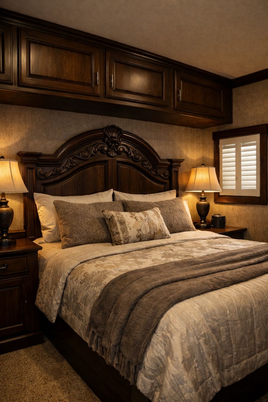 The bedroom offers a serene escape with its continuation of dark wood elements and cozy atmosphere. A king-sized bed with a carved wooden headboard takes center stage, dressed in plush linens that invite restful slumber. Soft lighting from bedside lamps creates a soothing ambiance, while a small window with white plantation shutters allows for adjustable natural light. The overall design is one of understated elegance, providing a restful retreat within this unique home.