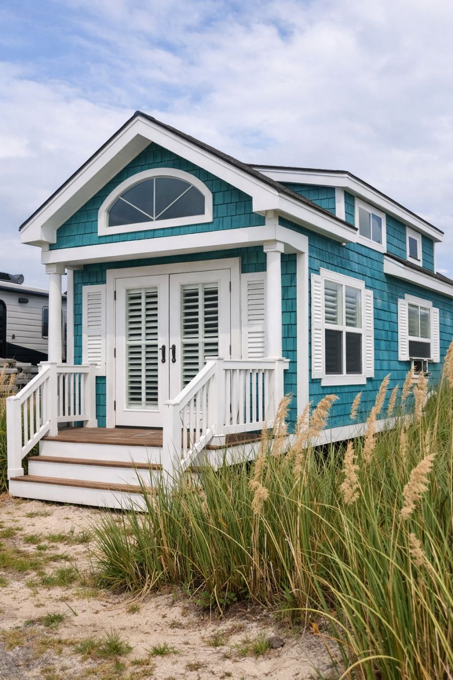 The exterior of this park model RV is a delightful nod to coastal architecture. Wrapped in teal cedar shake siding, it exudes a sense of tranquility and charm. The crisp white plantation shutters and trim add a classic touch, while the tall coastal dune grasses surrounding the structure whisper gently in the breeze, enhancing the seaside aesthetic. Viewed from a 3/4 angle, the amateur photography captures the quaint yet inviting aura of this charming mobile abode.