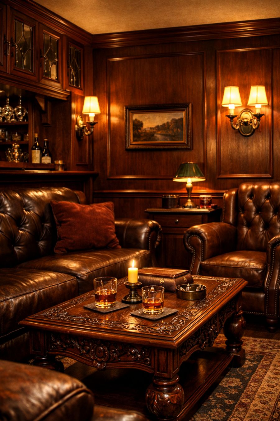 Stepping inside, the living area transports you to a different world with its dark wood English pub interior. Rich mahogany paneling lines the walls, creating a warm and inviting atmosphere that contrasts sharply with the bright exterior. Plush leather seating is arranged around a small, intricately carved coffee table, evoking the coziness of a traditional pub. Ambient lighting, courtesy of brass sconces, casts a golden glow, enhancing the room's intimate feel.