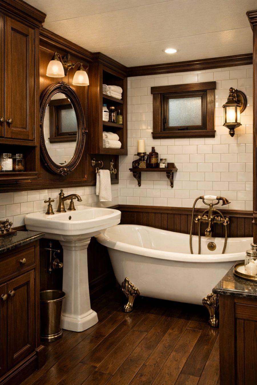 The bathroom is a study in elegance and functionality, featuring dark wood cabinetry and vintage-inspired fixtures. The deep clawfoot tub serves as a focal point, inviting relaxation amidst the pub-like atmosphere. White subway tiles line the walls, creating a clean contrast to the rich wood tones. A pedestal sink with antique brass fixtures adds a touch of sophistication, while ample storage ensures all essentials are neatly tucked away. The space is thoughtfully designed to offer both comfort and style.