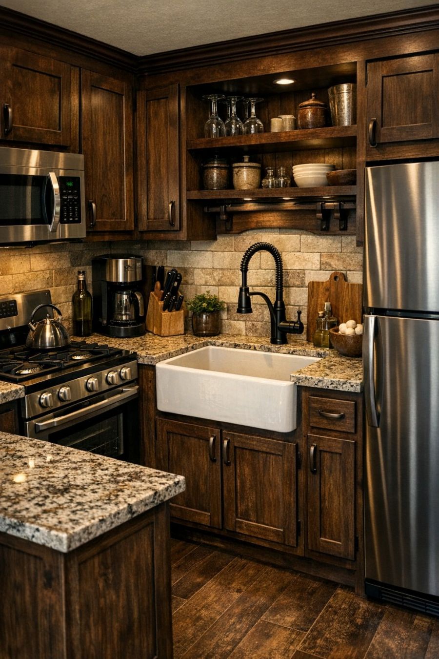 The kitchen area marries functionality with style, featuring dark wood cabinetry that complements the overall theme. Granite countertops provide ample workspace, their smooth surface ideal for culinary endeavors. Stainless steel appliances add a modern touch, while a deep farmhouse sink offers both practicality and rustic charm. The layout is compact yet efficient, ensuring everything is within easy reach while maintaining the aesthetic appeal of an old-world pub.