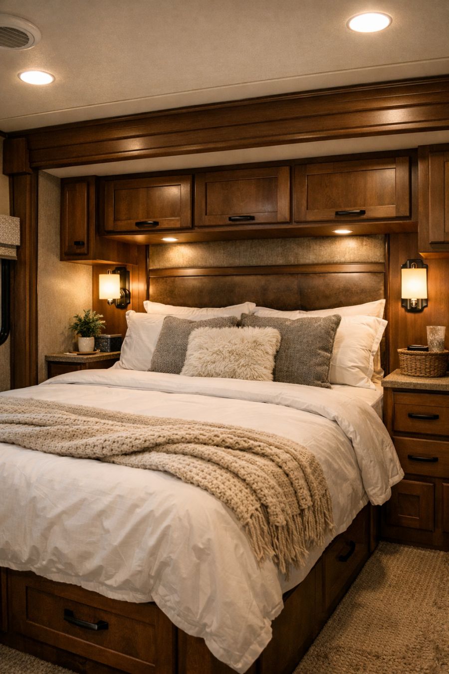 The bedroom offers a serene retreat, with a plush queen-sized bed dressed in crisp white linens and soft, textured throws. Rich, wooden accents frame the sleeping area, while soft lighting creates an intimate and calming atmosphere. Built-in storage maximizes the space, ensuring a clutter-free environment that feels both luxurious and cozy. The design is a perfect blend of rustic elements and modern comforts, providing a restful haven at the end of each day.