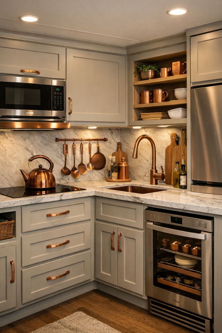 The kitchen area is a masterclass in compact luxury, featuring high-end appliances discreetly integrated into bespoke cabinetry. The cabinets, painted in a soft, muted hue, complement the marble countertops that offer a touch of classic elegance. Copper accents, from the taps to the cookware, add warmth and a nod to rustic charm. Despite its size, the kitchen is designed for both functionality and style, with ample storage and clever design solutions that make cooking a delight rather than a chore.