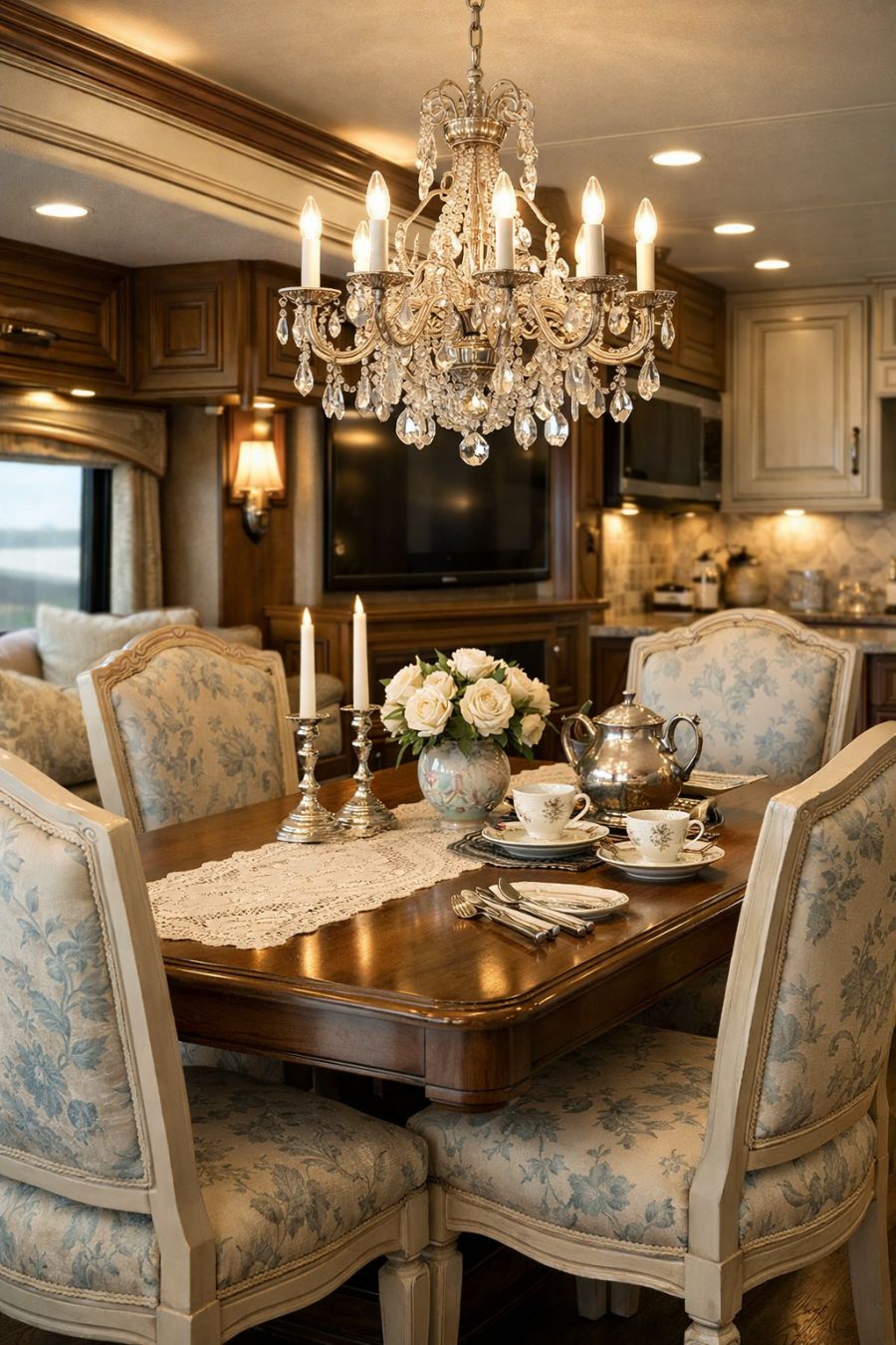 The dining area continues the theme of understated opulence, with a charming dining table set under an exquisite chandelier that casts a soft, inviting glow. The table is surrounded by high-backed chairs, upholstered in a gentle floral pattern that nods to classic French Country aesthetics. Subtle touches, such as antique silverware and delicate porcelain, add layers of sophistication to the setting. The open layout ensures seamless interaction with the living area, creating a space that is both intimate and expansive.