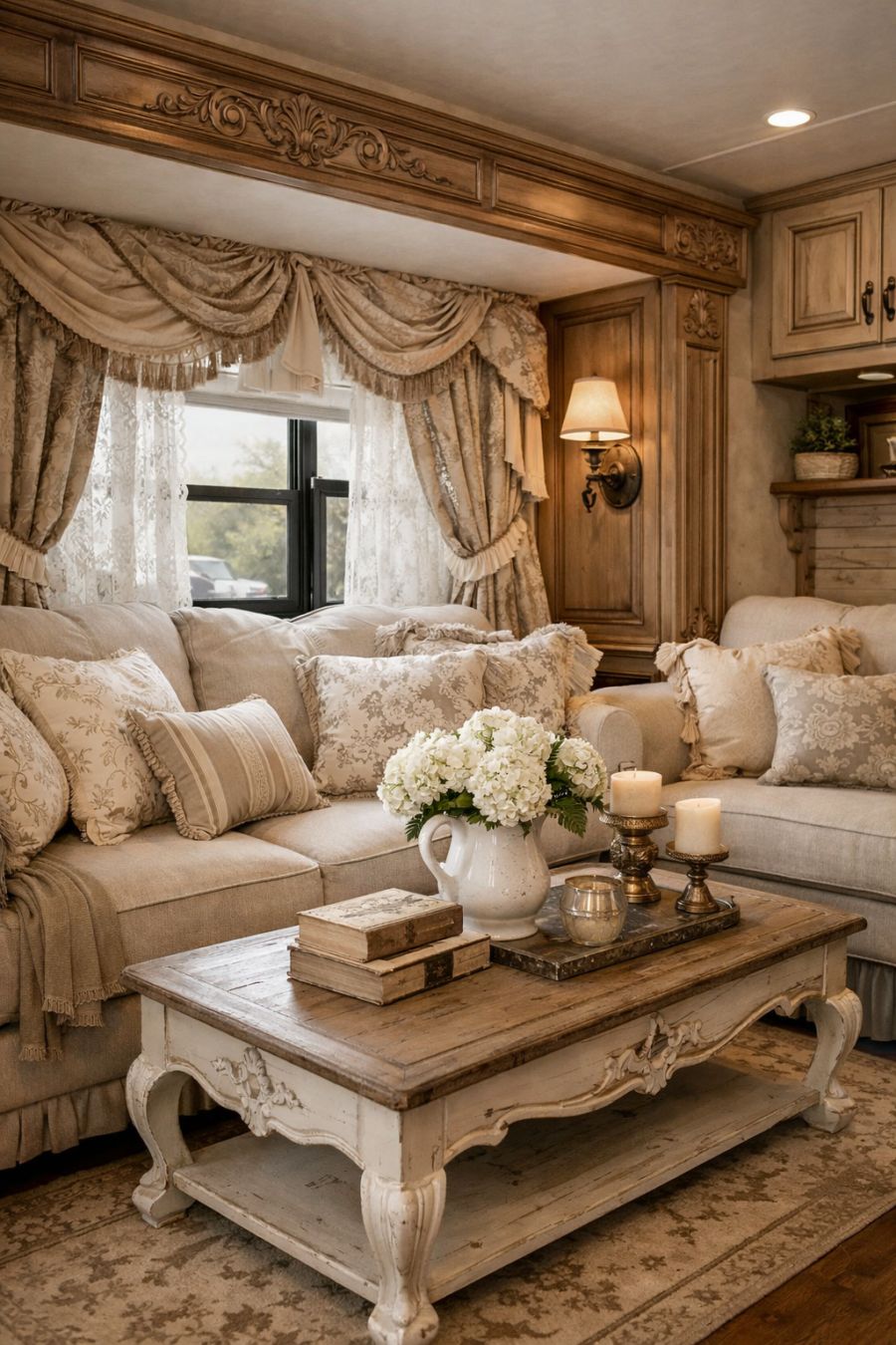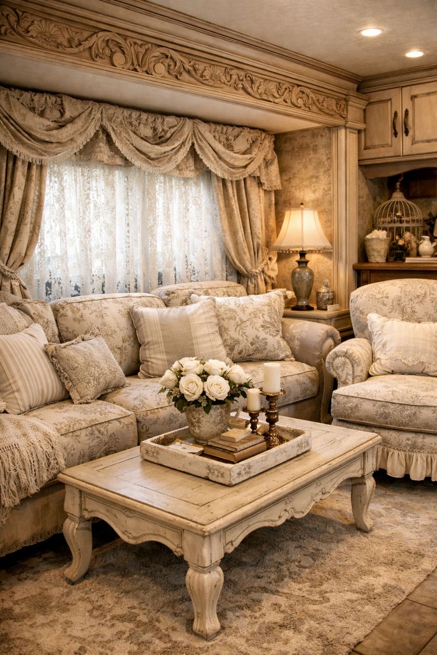 Stepping inside, you're greeted by a plush French Country interior that feels worlds away from the rugged exterior. The living area is adorned with soft, neutral tones that play off the delicate patterns of the elegant upholstery. Ornate woodwork frames the windows, which are draped in luxurious fabrics that cascade gracefully to the floor. A tastefully arranged sitting area invites relaxation, with oversized cushions and a vintage-inspired coffee table completing the ensemble. The overall ambiance is one of warmth and inviting comfort, skillfully blending rustic charm with refined elegance.