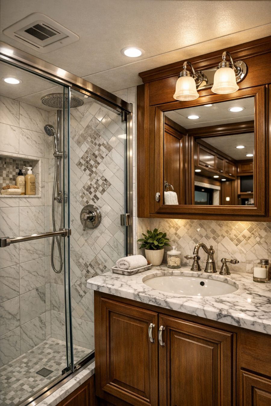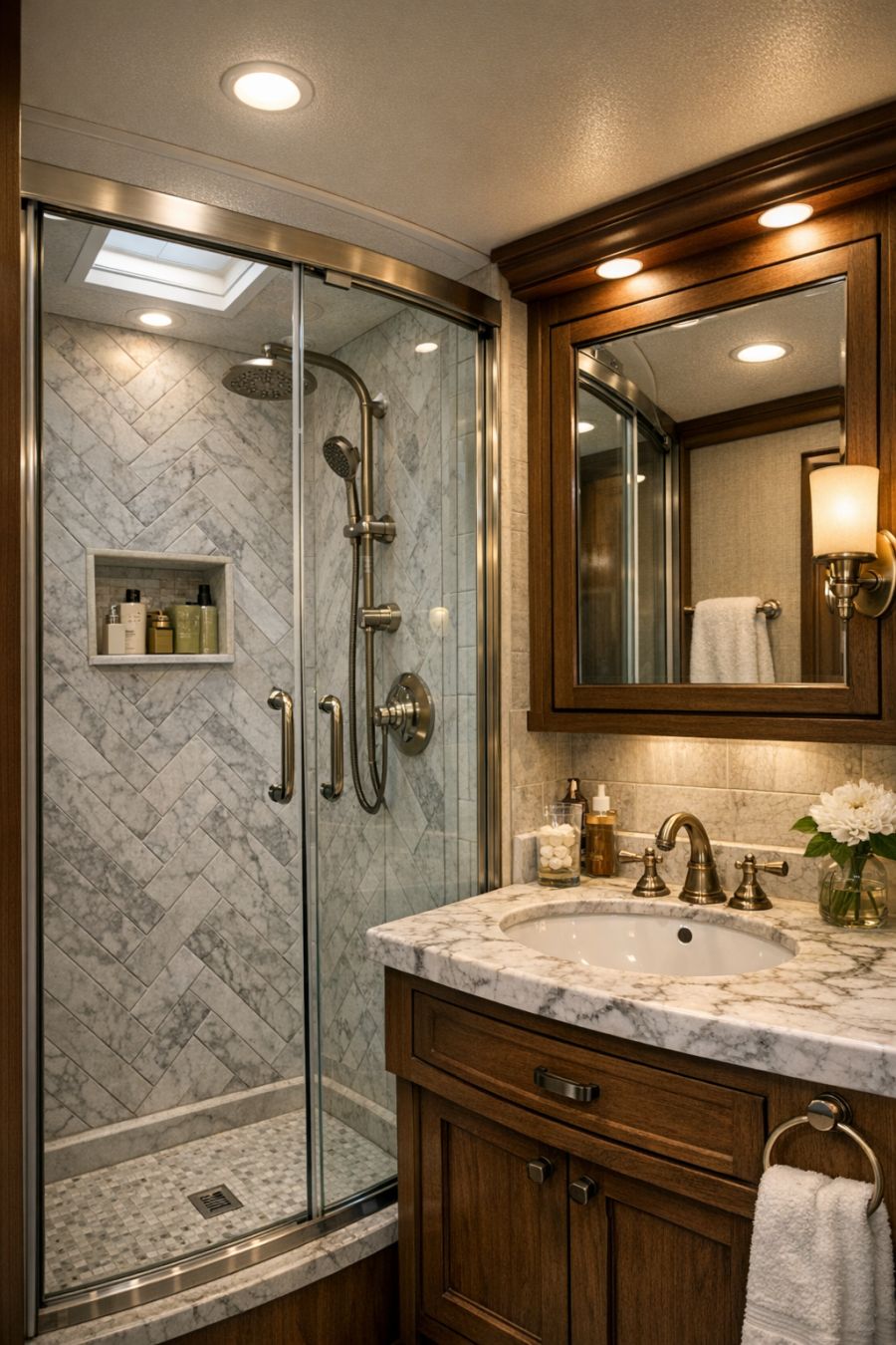 The bathroom is a testament to the ingenuity of luxury design in small spaces. Featuring a walk-in shower with glass doors and elegant tiling, it combines functionality with style. The vanity area boasts a marble countertop and a vintage-inspired sink, adding a touch of classic elegance. Soft, ambient lighting and carefully chosen fixtures enhance the overall atmosphere, creating a space that feels both refreshing and rejuvenating. With its thoughtful layout, the bathroom ensures every inch is utilized to its fullest potential.
