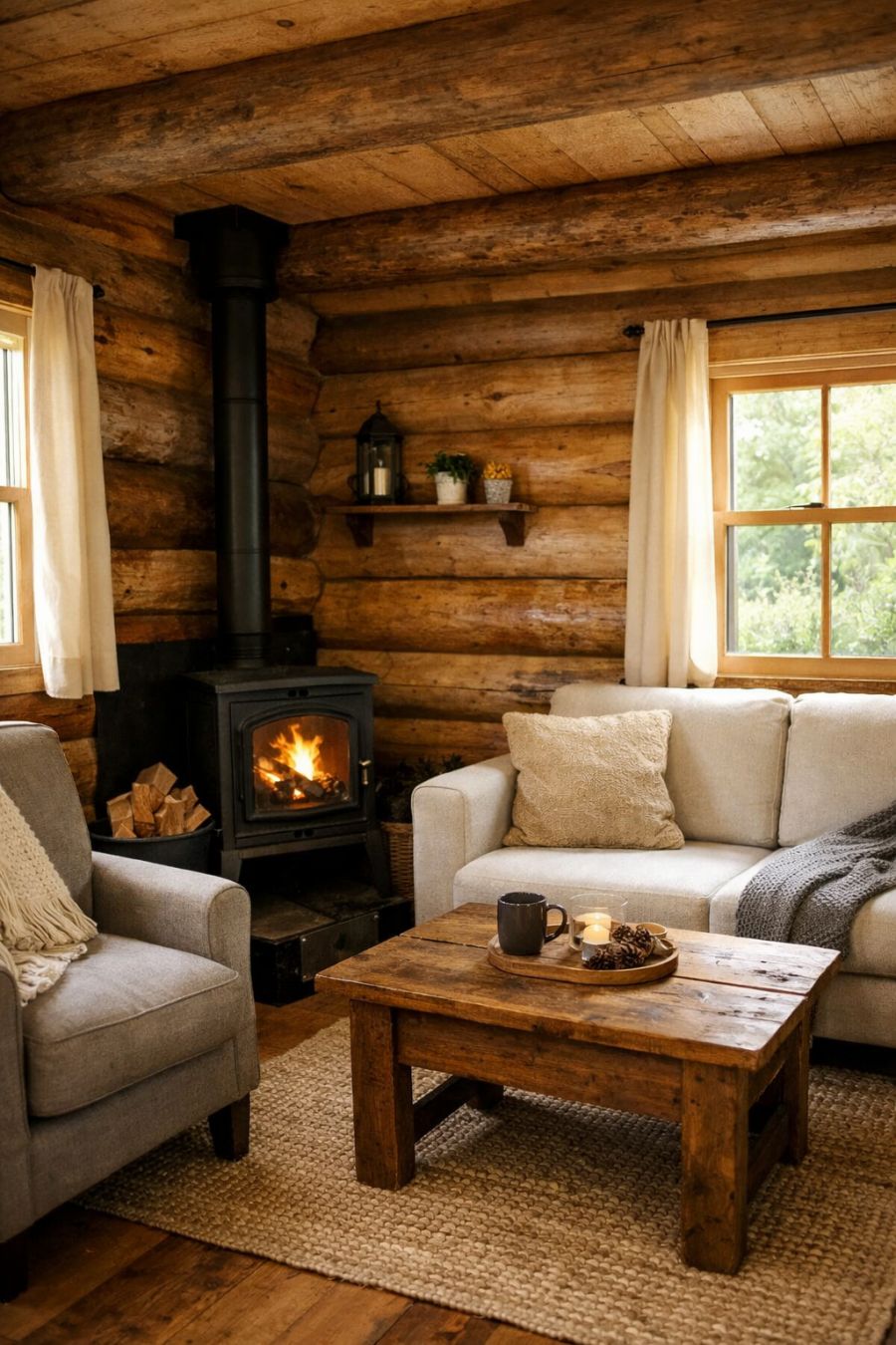 Stepping inside, the living area welcomes you with its inviting simplicity and rustic elegance. Exposed log walls and a wooden beam ceiling create an atmosphere of warmth and coziness. A small wood-burning stove sits in the corner, offering a focal point and a source of heat. The furnishings are minimal yet functional, with a comfortable armchair and a small sofa positioned to take advantage of the natural light streaming in through the windows.