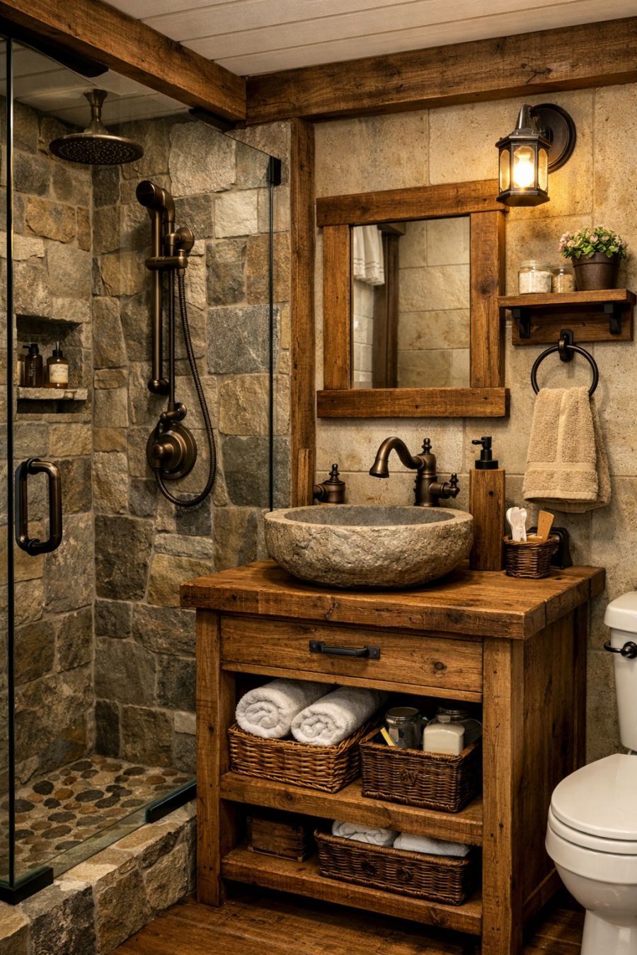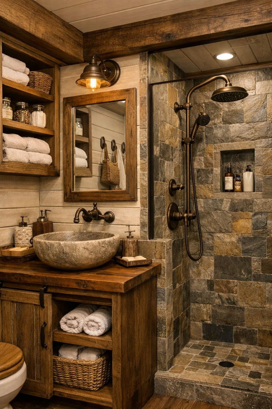 The bathroom area is a study in rustic elegance, featuring materials that blend seamlessly with the cabin's overall design. Natural stone tiles line the shower, evoking the feel of a mountain spring. A wooden vanity with a vessel sink adds a touch of artisanal craftsmanship, while the fixtures are finished in aged bronze, lending a vintage feel. The color scheme is neutral, with earth tones that enhance the sense of tranquility and connection to nature. Despite its compact size, the bathroom is designed for maximum functionality, with smart storage solutions and efficient use of space.