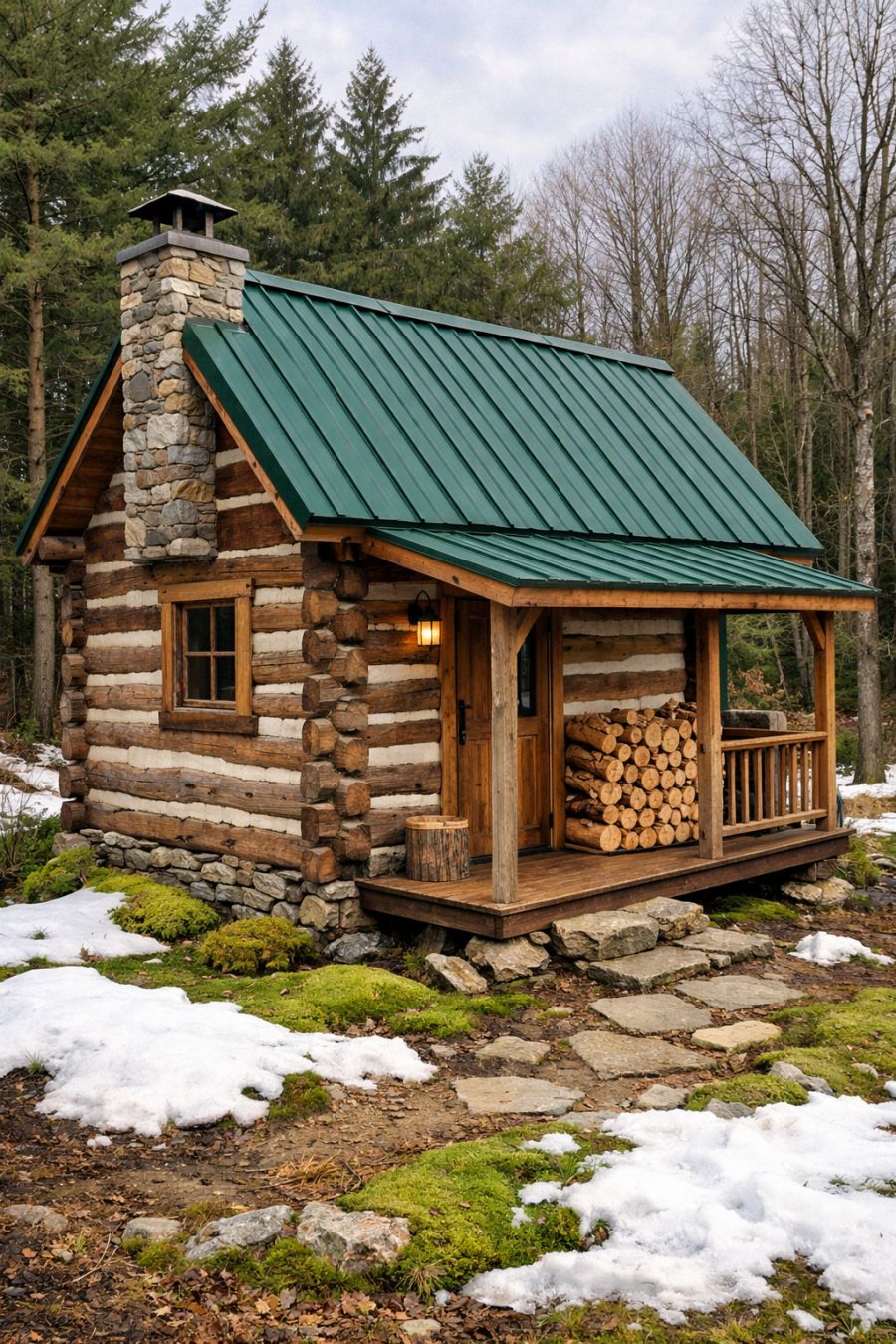The exterior of this log cabin tiny home is a rustic ode to the past, with chinked logs that exude warmth and authenticity. The forest green tin roof offers a striking contrast to the natural wood tones and provides excellent protection against the elements. A small stone chimney peeks out from one side, hinting at the cozy warmth within. On the side porch, a neatly stacked pile of firewood promises long, warm evenings by the fire, while patches of late-melting snow intermingle with fresh green moss, adding to the cabin's picturesque charm.