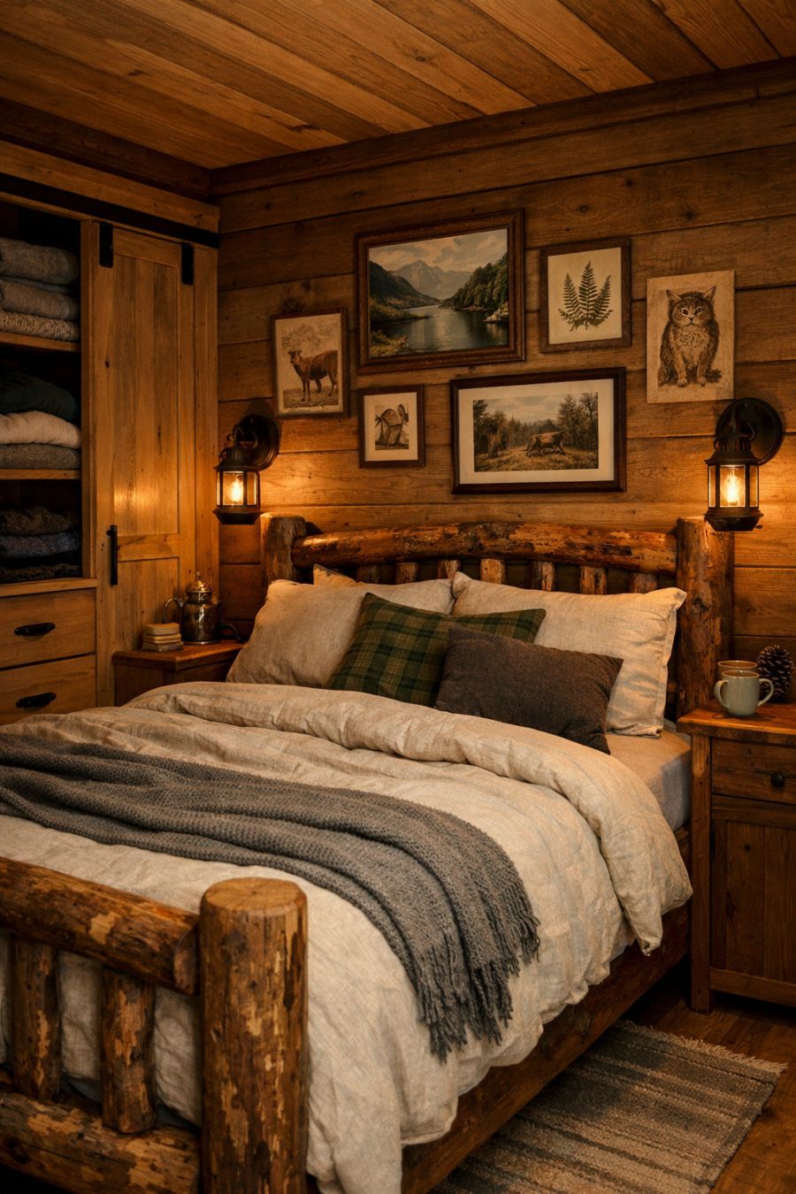 The bedroom is a cozy retreat that reflects the cabin's overall aesthetic of simplicity and warmth. A log-framed bed takes center stage, dressed in soft, natural linens that invite relaxation. The walls are adorned with vintage prints and nature-inspired artwork, adding a personal touch. Soft lighting creates a tranquil atmosphere, perfect for unwinding after a day spent exploring the great outdoors. A small built-in wardrobe provides storage without sacrificing space.