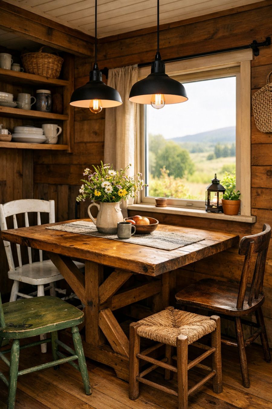 The dining area is a charming nook that combines functionality with rustic style. A handcrafted wooden table, paired with mismatched chairs, provides a sense of character and individuality. The table is positioned near a window, allowing diners to enjoy views of the surrounding landscape. Simple pendant lighting above the table adds a touch of modernity, while the overall design remains true to the cabin's frontier inspiration.