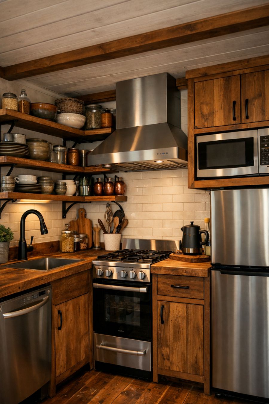 The kitchen area is compact yet thoughtfully designed to maximize utility and style. Wooden cabinetry provides ample storage, and the countertops are crafted from reclaimed wood, adding a touch of sustainability to the space. Modern appliances are seamlessly integrated into the rustic design, ensuring that cooking is both convenient and enjoyable. Open shelving displays a collection of rustic dishware, enhancing the cabin's homey appeal.