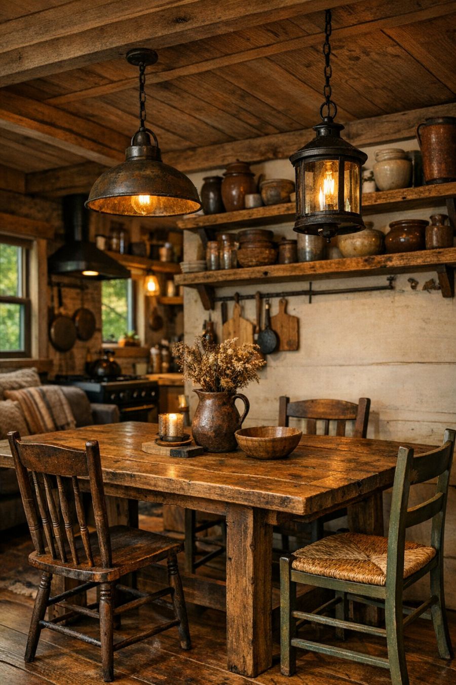 The dining area seamlessly integrates with the living space, maintaining the cabin's rustic theme. A handcrafted wooden dining table serves as the centerpiece, surrounded by mismatched wooden chairs that add character. The space is adorned with vintage-inspired light fixtures that cast a warm glow during meals. Shelving made from reclaimed wood displays an array of earthenware and ceramics, further emphasizing the rustic aesthetic. The proximity to the kitchen makes it an ideal spot for enjoying meals while taking in views of the surrounding natural landscape.