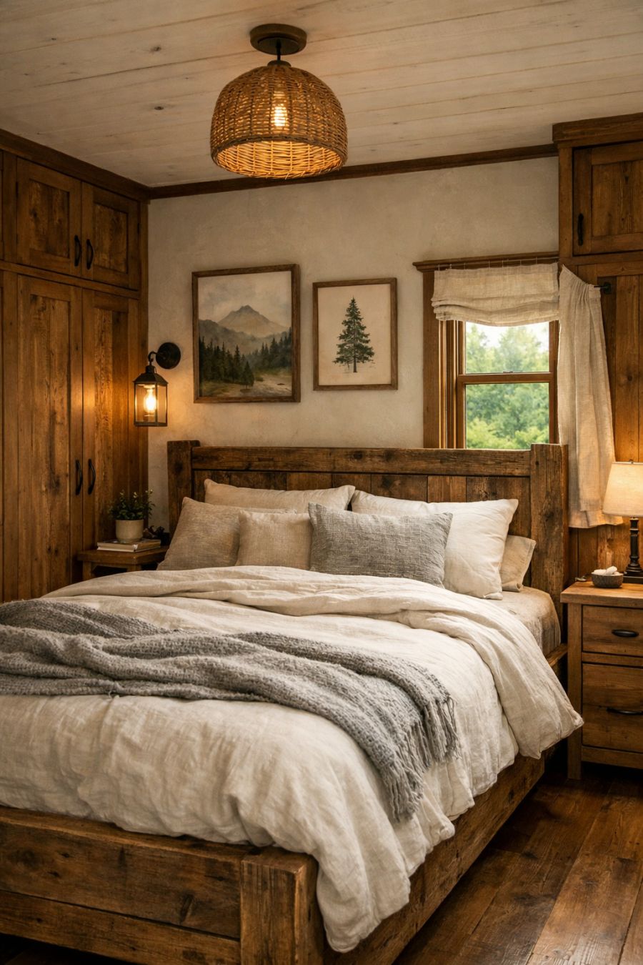 The bedroom is a serene retreat, reflecting the cabin's rustic charm and commitment to comfort. A queen-sized bed, crafted from reclaimed wood, takes center stage, dressed in soft, natural linens that invite relaxation. The walls are adorned with simple, nature-inspired artwork, enhancing the room's peaceful ambiance. Ample storage is provided by built-in wooden wardrobes, ensuring the space remains clutter-free. Soft lighting and a small window with picturesque views create an intimate and restful atmosphere, perfect for unwinding after a day spent in nature.
