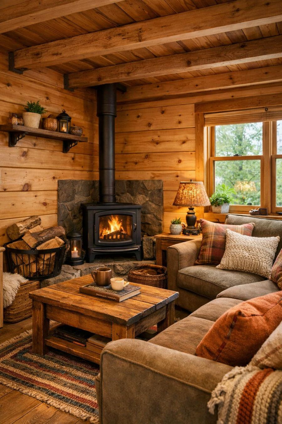 The living area is a cozy haven with a warm and inviting atmosphere. Natural wood tones dominate the space, with exposed wooden beams and pine walls that echo the cabin's exterior. A plush, earth-toned sofa is strategically placed around a small, charming wood-burning stove, perfect for gatherings on chilly evenings. Rustic accents, such as woven rugs and handcrafted wooden furniture, enhance the space's rustic charm, while large windows allow natural light to flood in, creating a bright and airy feel.