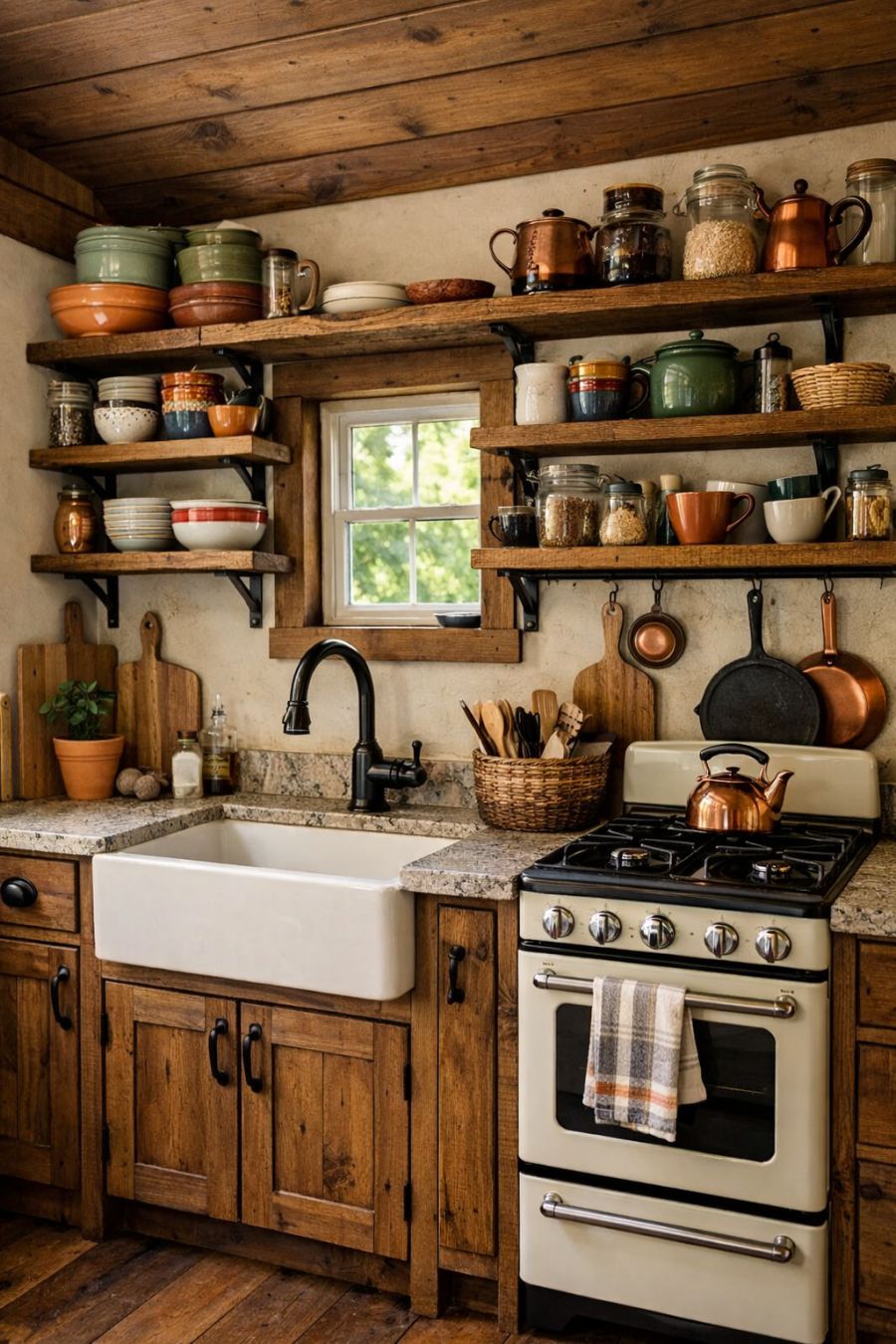 The kitchen is compact yet efficient, designed with both functionality and style in mind. Rustic wooden cabinetry provides ample storage, complemented by stone countertops that offer a durable and elegant workspace. A vintage-style gas stove and a deep farmhouse sink serve as focal points, blending modern conveniences with traditional charm. Open shelving made from reclaimed wood showcases a selection of colorful crockery and adds a personal touch to the space. Natural light pours in through a small window, illuminating the kitchen's warm, earthy tones and creating a welcoming environment for culinary creativity.