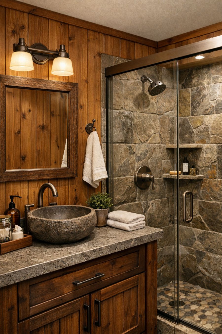 The bathroom is a study in rustic elegance, featuring materials and design elements that echo the cabin's overall aesthetic. The walls are clad in natural wood paneling, creating a warm and inviting atmosphere. A sleek, stone-topped vanity provides ample space for toiletries, while a modern yet rustic basin adds a touch of sophistication. The shower is enclosed with glass, offering a spacious feel, and features stone tiles that mimic the textures of the surrounding landscape. Simple, understated fixtures in a brushed metal finish complete the look, ensuring the space is both functional and stylish.