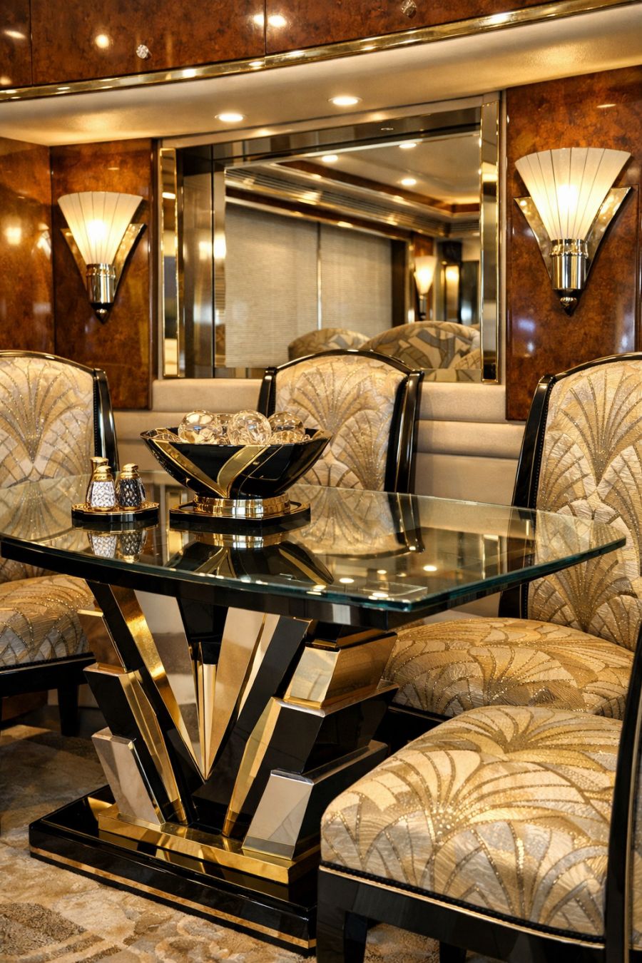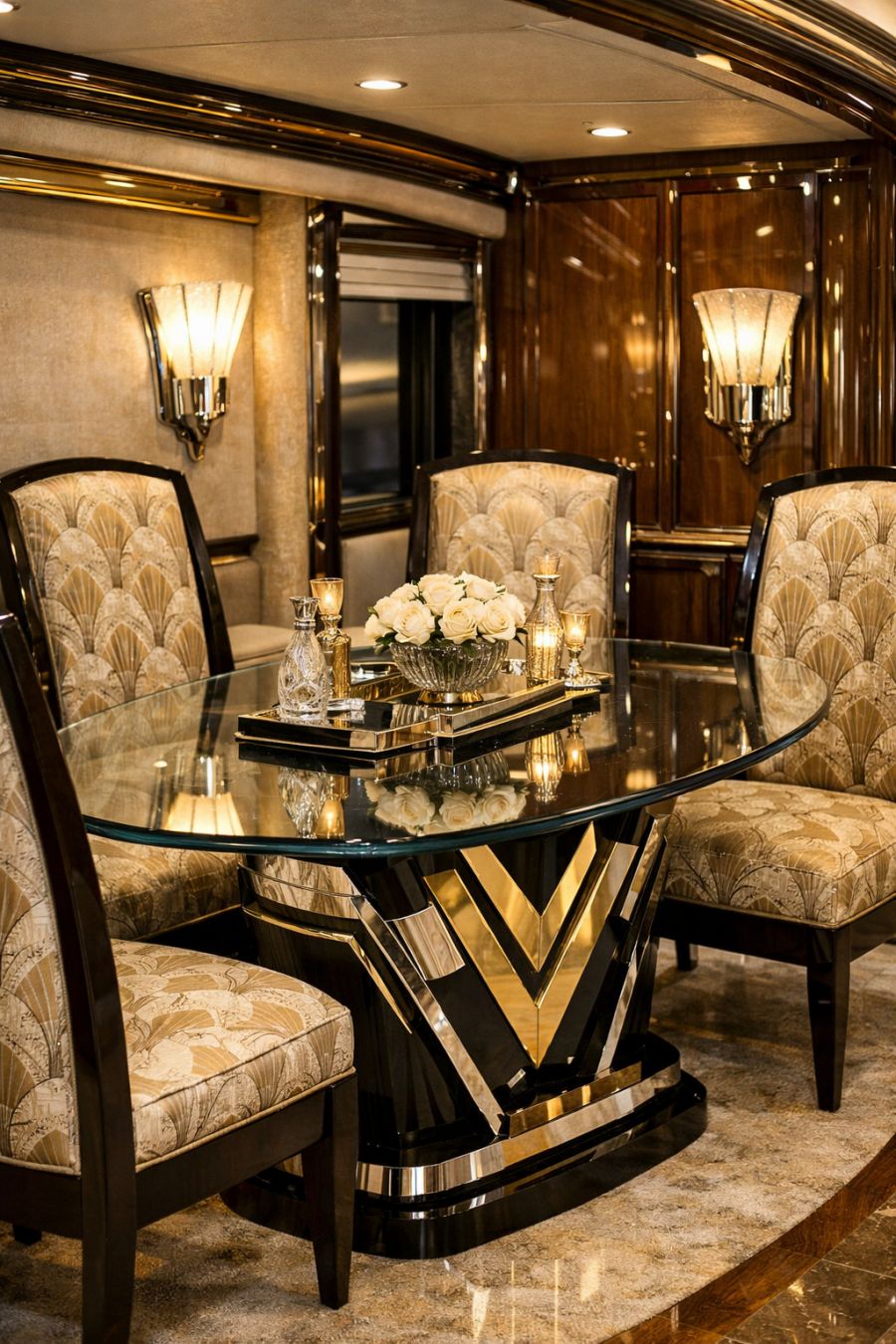 The dining area continues the Art Deco theme with a stunning glass-topped table surrounded by high-backed chairs upholstered in a lavish fabric. The table's base features a striking geometric design, a hallmark of the era's style. Elegant sconces on the walls provide soft lighting, creating an intimate atmosphere perfect for both casual meals and formal gatherings. Gold and silver accents add a touch of glamour, making every dining experience feel like a special occasion.