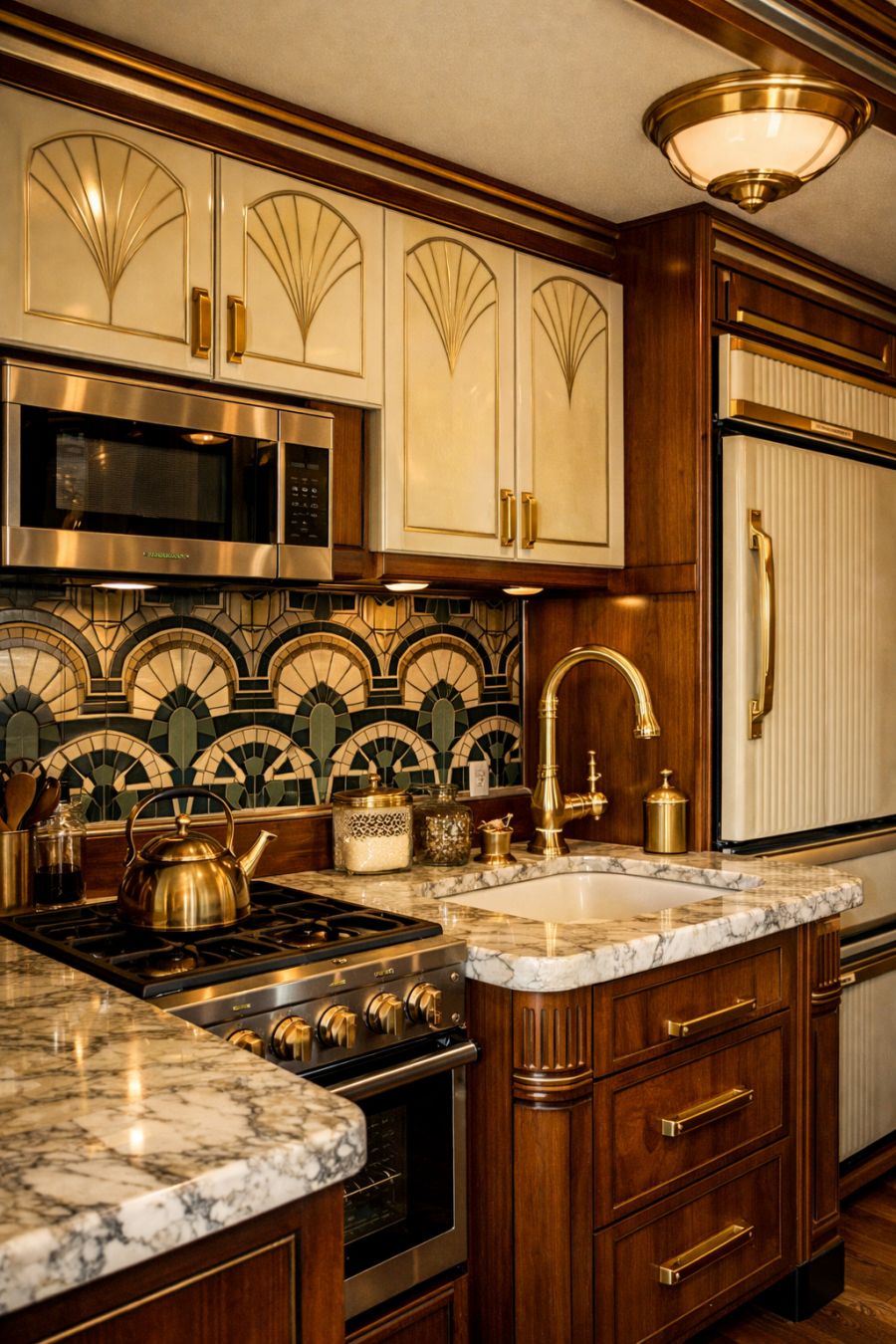 The kitchen area is a masterpiece of functional design melded with vintage style. Custom cabinetry with art deco detailing offers ample storage, while modern appliances are seamlessly integrated to maintain the period aesthetic. The countertop, made of polished marble, provides a luxurious workspace, and the backsplash features intricate tile work reminiscent of the 1920s. Brass fixtures and hardware add a final touch of elegance, completing this beautifully cohesive space.