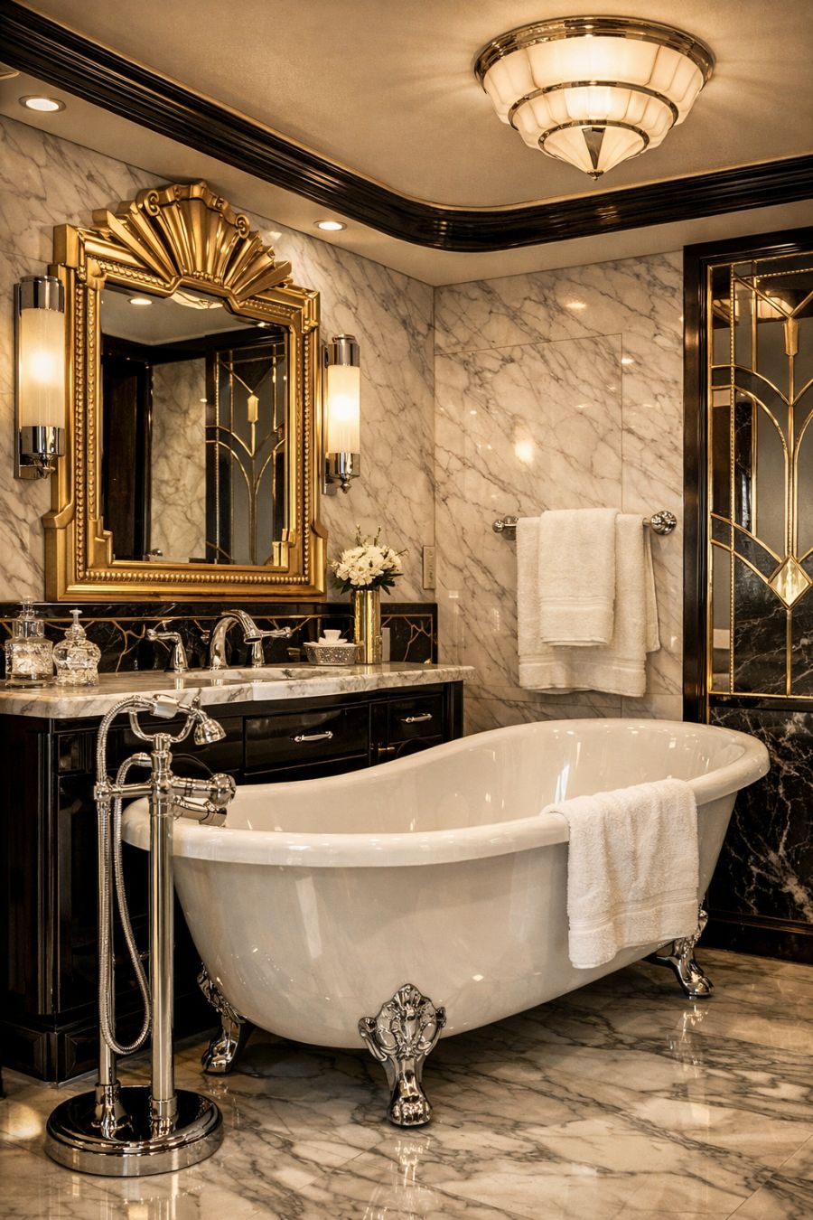 The bathroom is an epitome of Art Deco luxury, featuring a blend of high-end materials and meticulous craftsmanship. Marble floors and walls create a timeless elegance, while a freestanding clawfoot tub invites moments of relaxation. The fixtures are a polished chrome, lending a modern twist to the vintage aesthetic. An ornate mirror framed in gold hangs above the vanity, reflecting the thoughtful details and adding a touch of glamour to the space.