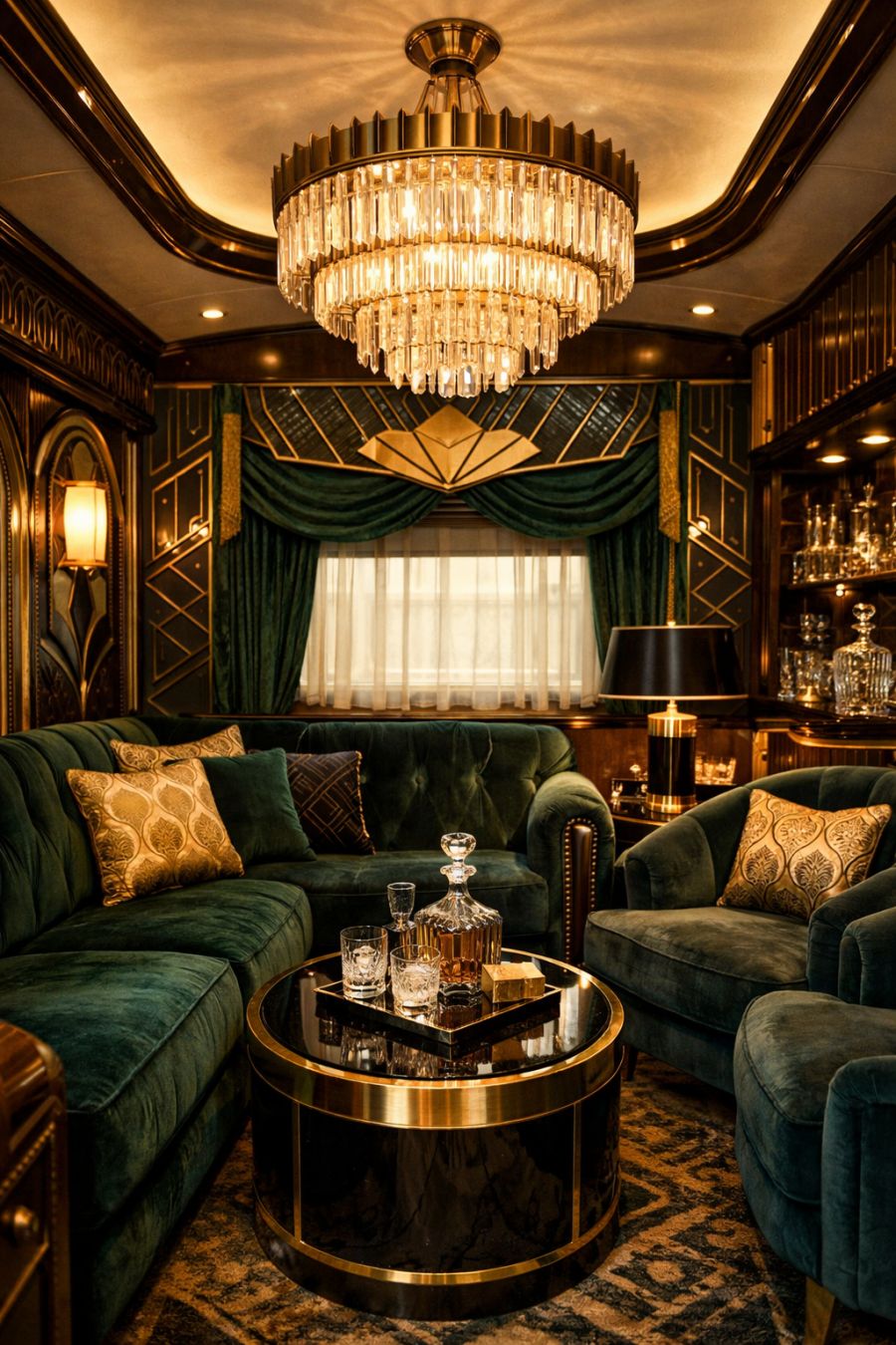 As you step inside, the living area greets you with an opulent 1920s Art Deco interior. Plush seating upholstered in rich velvets invites you to sink into its embrace, surrounded by intricate geometric patterns that adorn the walls. The color palette is a blend of deep emerald greens and gold accents, creating a space that feels both luxurious and inviting. A handcrafted chandelier hangs overhead, casting a warm glow that enhances the room's sophisticated charm.