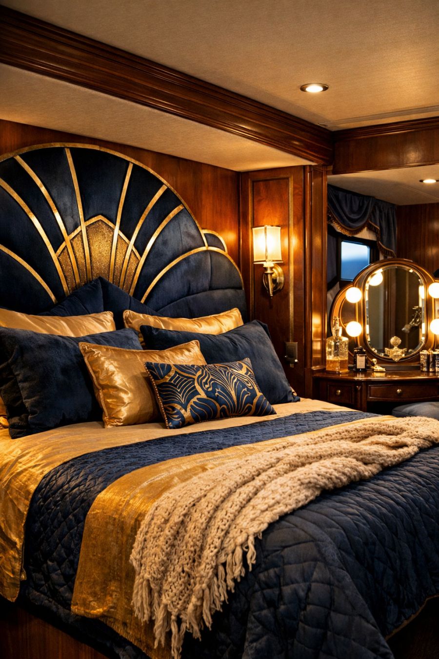 The bedroom is a sanctuary of comfort, with a sumptuous bed draped in layers of rich fabrics and textured throws. The headboard, an art deco masterpiece, serves as a focal point, drawing the eye with its bold shapes and patterns. A vintage vanity set graces one corner, offering a chic spot for morning routines. The color scheme is a soothing mix of deep blues and golds, creating a restful environment that promises a peaceful night's sleep.
