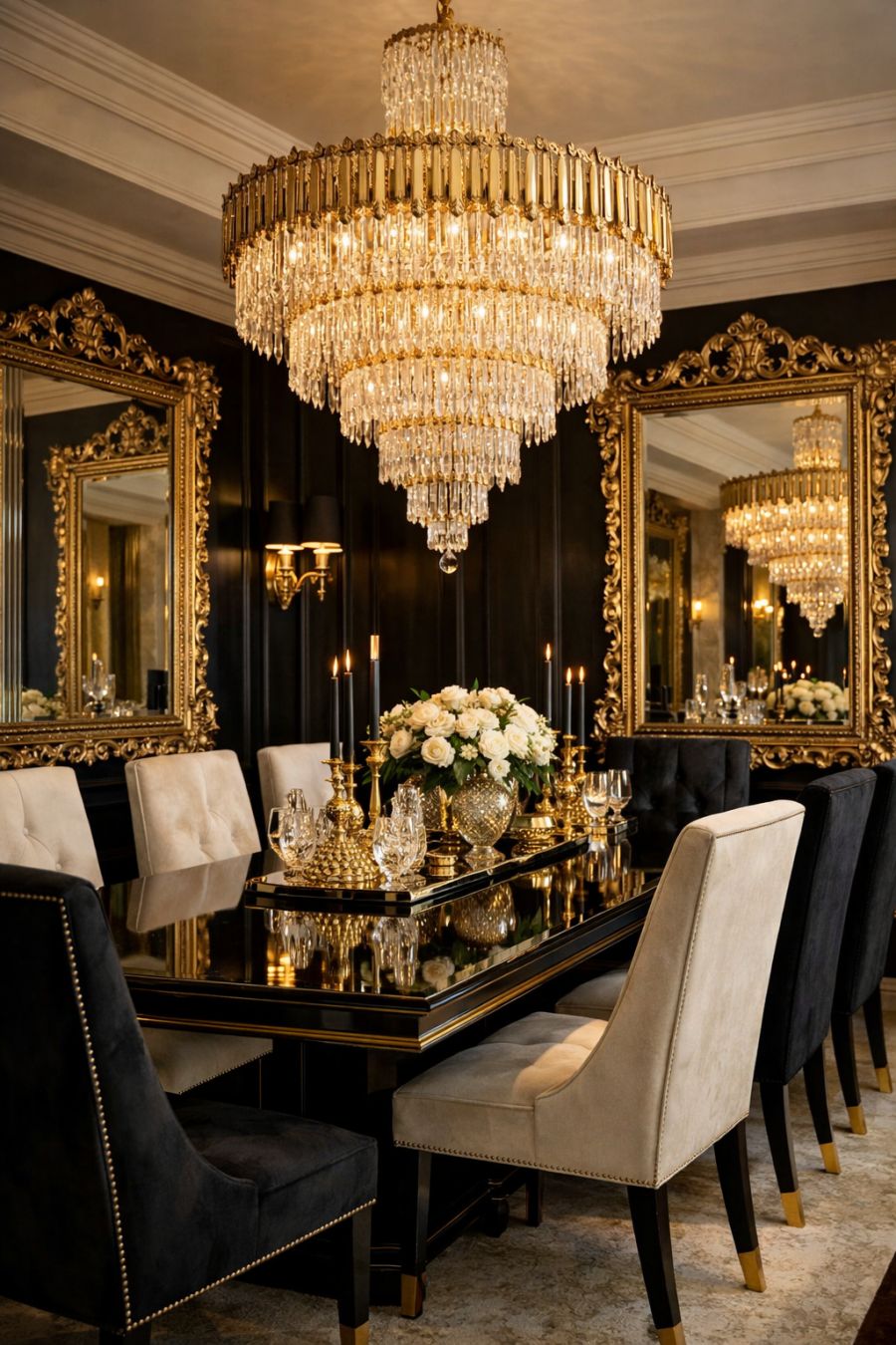 The dining area continues the theme of Hollywood glamour, with a striking centerpiece chandelier that draws the eye upward. Beneath it, a long, lacquered dining table is surrounded by high-backed chairs upholstered in luxurious fabric, inviting guests to linger over lavish meals. The walls are adorned with oversized, ornate mirrors that amplify the light and space, creating an atmosphere of grandeur. Gold and black accents intermingle, evoking a sense of drama and sophistication that transforms every meal into a special occasion.