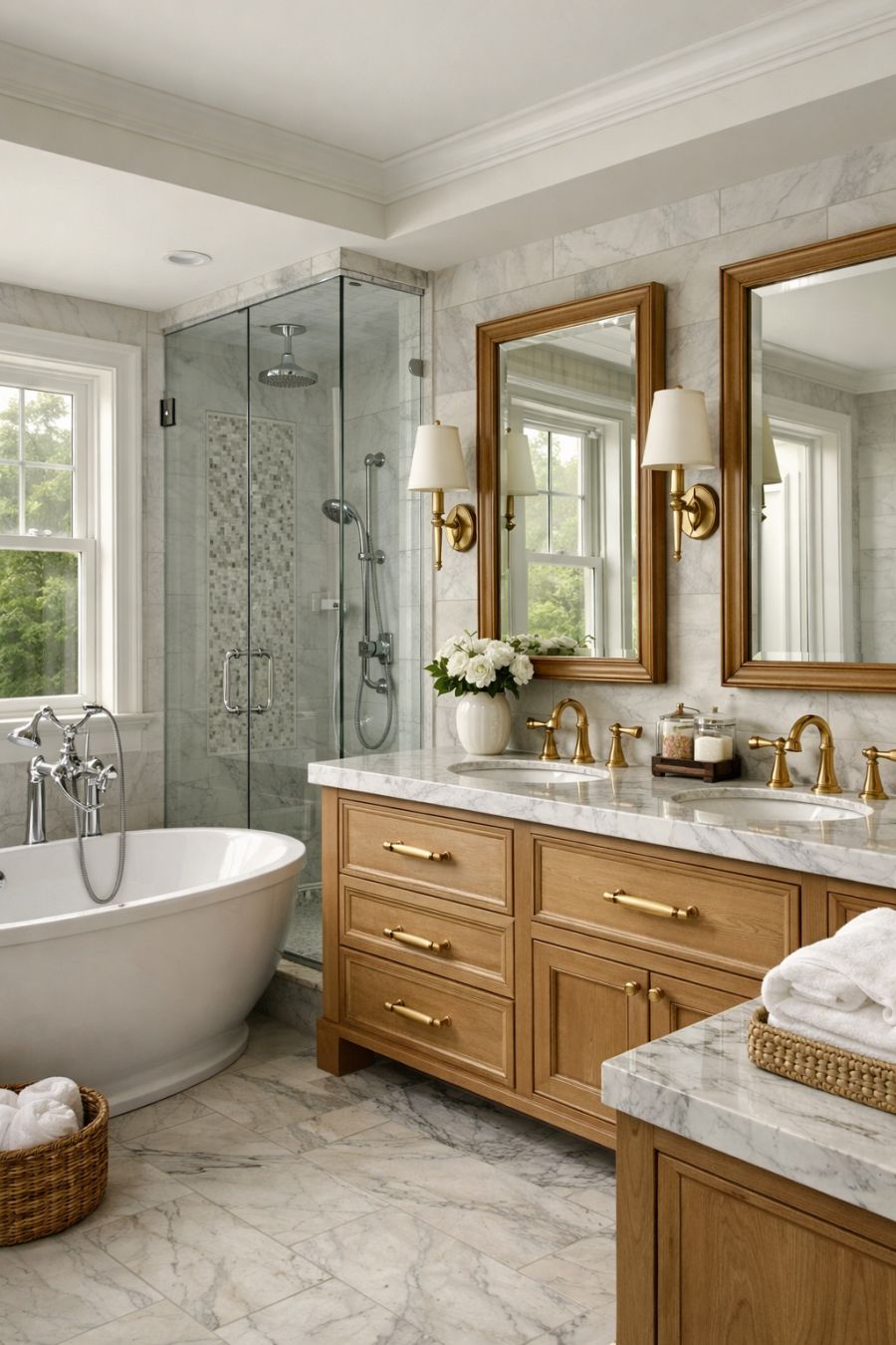 The bathroom embodies a spa-like ambiance, where luxury and functionality converge in perfect harmony. Gleaming marble surfaces and intricate tilework create a sense of sophistication and timeless beauty. The freestanding soaking tub invites relaxation, positioned to take advantage of natural light streaming through large windows. Elegant chrome fixtures and a spacious glass-enclosed shower add modern touches, while the double vanity offers ample space for personal care, adorned with polished brass accents that accentuate the room's refined aesthetic.