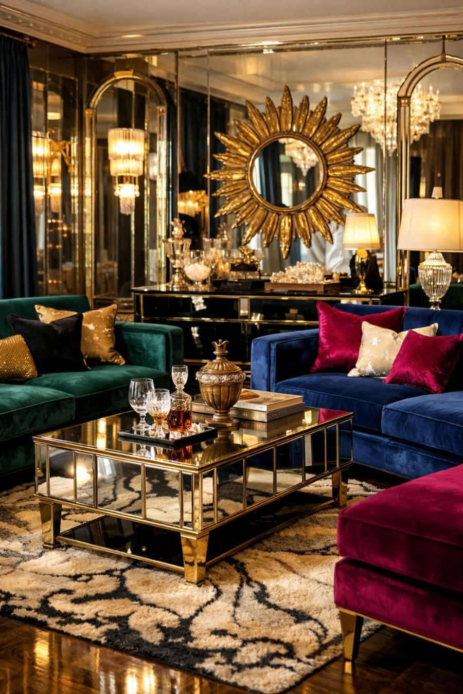 Step inside, and the living area transcends expectations with its glamorous Hollywood Regency interior. The space is adorned with sumptuous velvet sofas, their jewel tones echoing the opulence of a bygone era. Mirrored surfaces reflect light throughout the room, creating an illusion of endless space and luminosity. Gilded accents and art deco-inspired lighting fixtures punctuate the area with a sense of refined elegance, while plush area rugs underfoot add warmth and texture to the otherwise sleek and polished design.