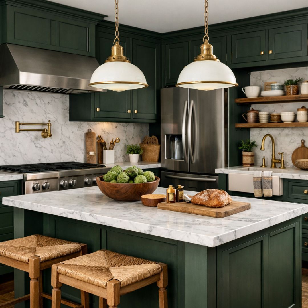 In the kitchen, functionality meets style in a seamless blend of modern convenience and vintage allure. Custom cabinetry painted in a rich, deep green provides ample storage, while marble countertops offer a touch of timeless elegance. High-end stainless steel appliances are paired with brass fixtures, adding a hint of warmth to the room's cool palette. The kitchen is as much a workspace as it is a gathering place, with a central island that doubles as a breakfast bar, encouraging conversation and connection.