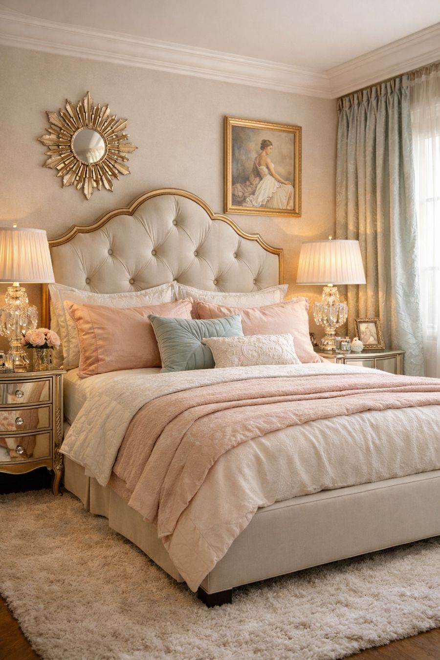 The bedroom is a sanctuary of serenity and style, enveloped in a palette of soft pastels and rich textures. A sumptuous king-sized bed, draped in layers of luxurious linens, takes center stage, flanked by elegant bedside tables with crystal lamps casting a gentle glow. The room is adorned with curated artwork and decorative pieces that speak to the Hollywood Regency aesthetic, blending classic elements with modern flair. Plush carpeting underfoot and heavy drapes at the windows complete the picture of comfort and opulence.