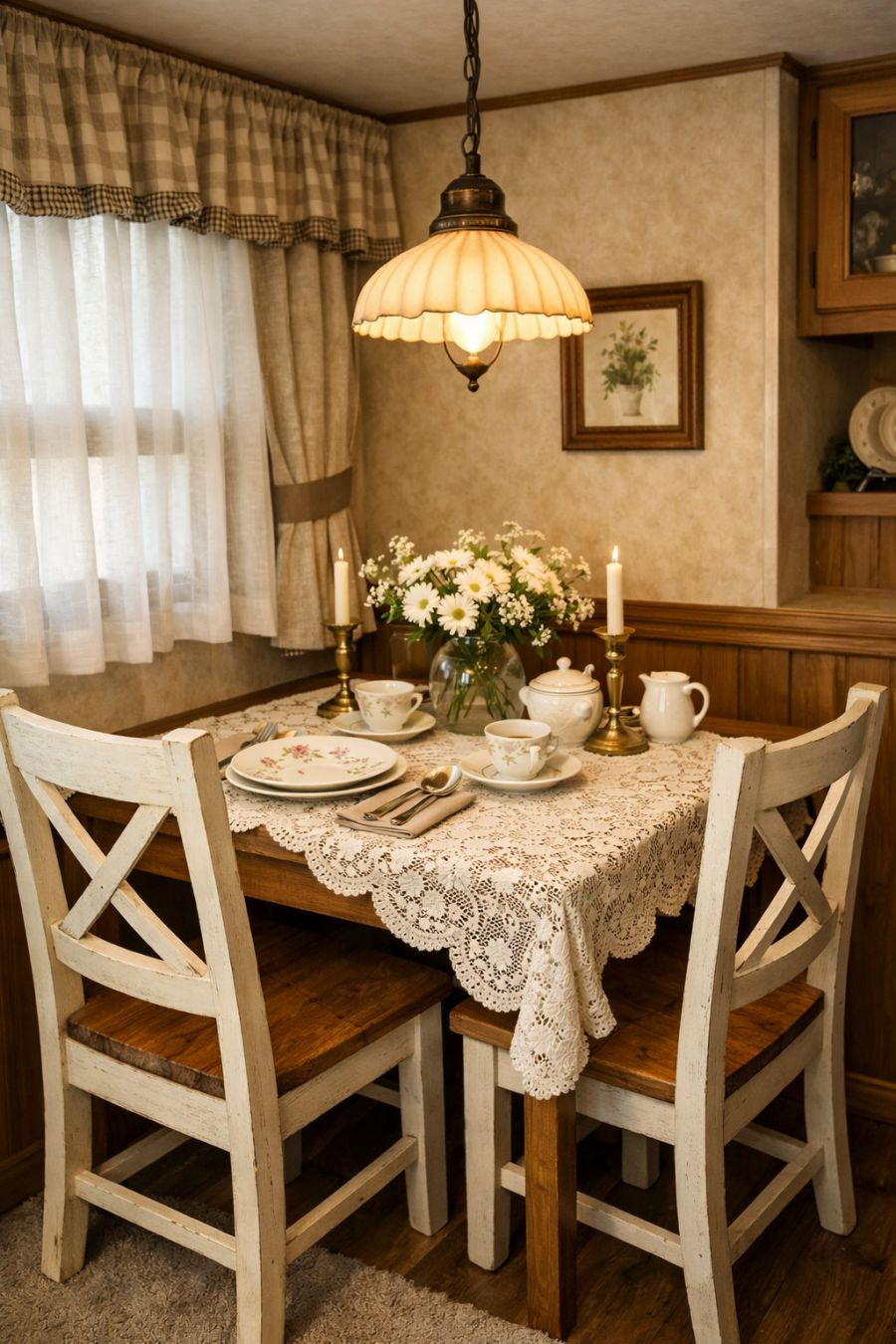 Adjacent to the living area is the quaint dining space, designed with both functionality and style in mind. A compact, yet charming wooden dining table is set against one wall, accompanied by two matching chairs that echo the cottage theme. The table is dressed with a delicate lace tablecloth and set with fine china, inviting a sense of elegance to every meal. Overhead, a vintage-style pendant light casts a warm glow, enhancing the intimate and inviting atmosphere of the dining area.