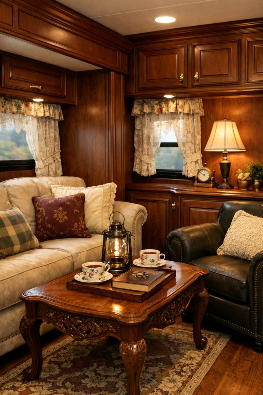 Stepping inside, you are immediately greeted by the warmth of rich mahogany woodwork that defines the living area. The walls are lined with elegant wooden panels, creating a cozy atmosphere reminiscent of a classic English cottage. Comfortable seating is arranged around a small, intricately carved wooden coffee table, providing a perfect spot for relaxation and conversation. The space is adorned with vintage-inspired decor, including soft throw pillows and delicate lace curtains that frame the windows, allowing natural light to gently illuminate the room.