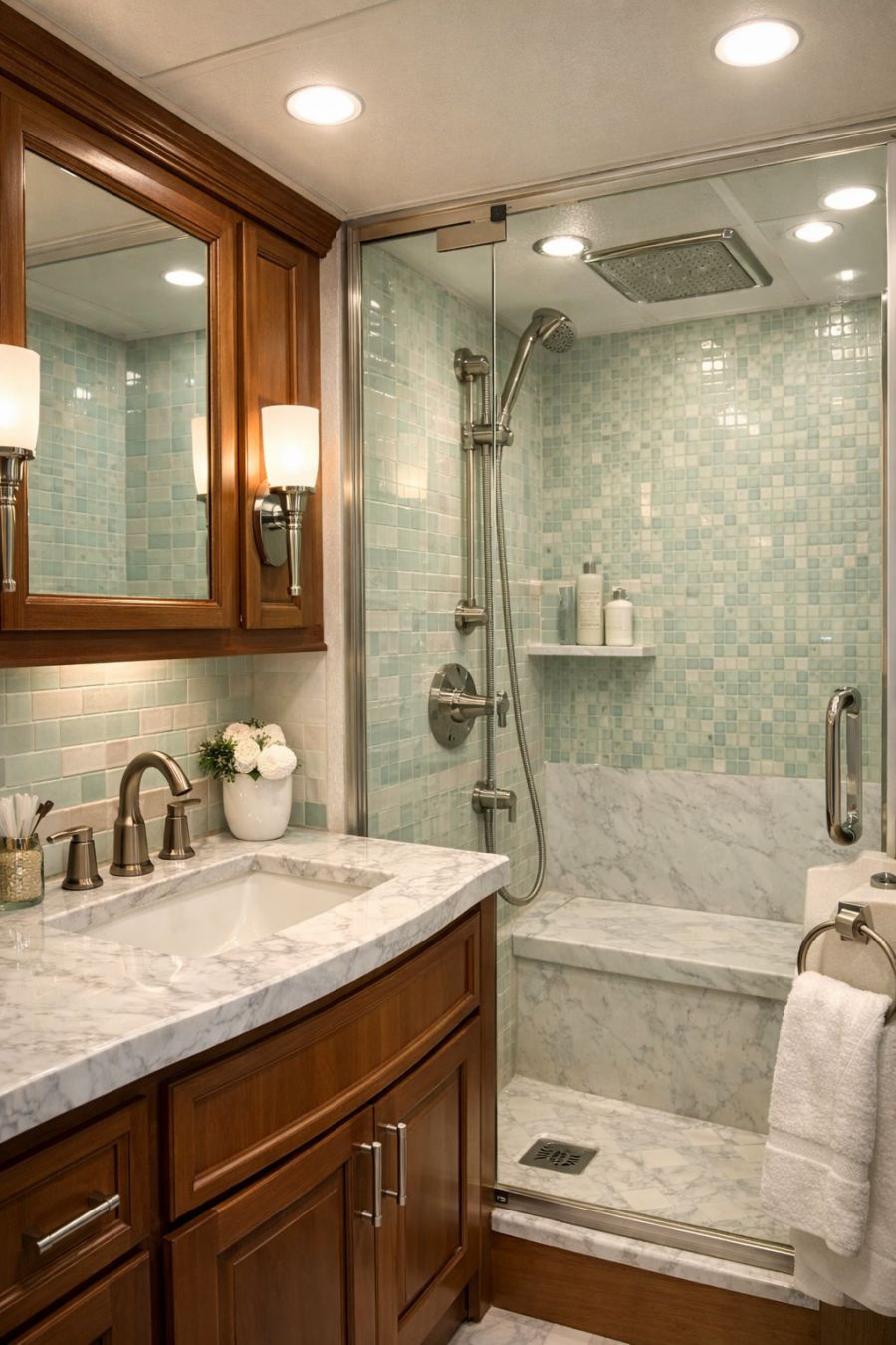 The bathroom is a testament to refined elegance and practical design, featuring a harmonious blend of classic and contemporary elements. The walls are adorned with soft pastel tiles, creating a soothing atmosphere that is both refreshing and calming. A polished marble vanity provides a luxurious touch, complemented by sleek, modern fixtures that offer both style and functionality. The shower area is enclosed with clear glass, maximizing space while maintaining a sense of openness. Overall, the bathroom is a sanctuary of cleanliness and tranquility, offering a spa-like experience within this compact abode.