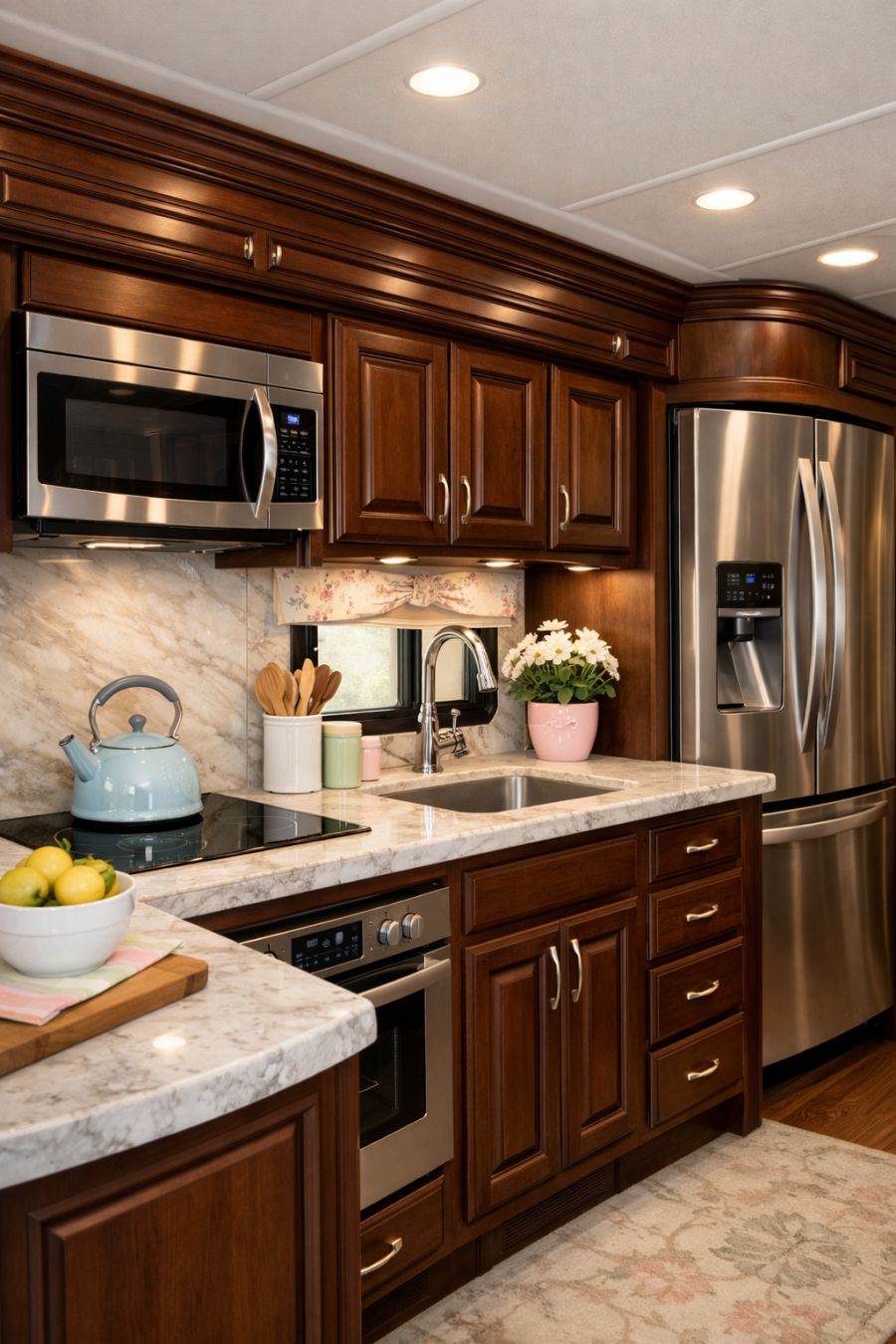 The kitchen is a masterpiece of space efficiency, combining modern conveniences with timeless style. Rich mahogany cabinetry offers ample storage, while marble countertops provide a sleek and durable workspace. State-of-the-art appliances are seamlessly integrated into the design, ensuring that functionality does not compromise the classic aesthetic. The kitchen's color palette is soft and neutral, with subtle hints of pastel to add a touch of whimsy, making this space both practical and delightful.