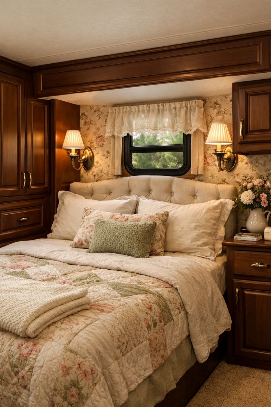 The bedroom area is a serene retreat, where the charm of an English cottage meets modern comfort. A plush bed, draped with an elegant quilt and soft linens, invites relaxation and rest. The walls are adorned with classic floral wallpaper, adding a touch of vintage charm to the space. Built-in mahogany wardrobes provide ample storage, while a small window allows natural light to filter in, creating a warm and inviting ambiance. Delicate sconce lighting adds a touch of sophistication, completing the room's elegant design.