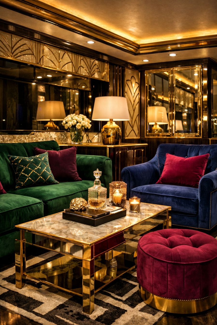 Stepping inside, the living area is a revelation of Hollywood Regency glamour. Plush velvet furnishings in rich jewel tones create a sense of opulence and warmth. Gold accents and mirrored surfaces enhance the light, reflecting the room’s elegance and creating an illusion of space. The walls are adorned with art deco-inspired patterns, adding a touch of sophistication, while the ambient lighting casts a soft, inviting glow. This area is a perfect blend of comfort and style, offering a luxurious retreat from the outside world.